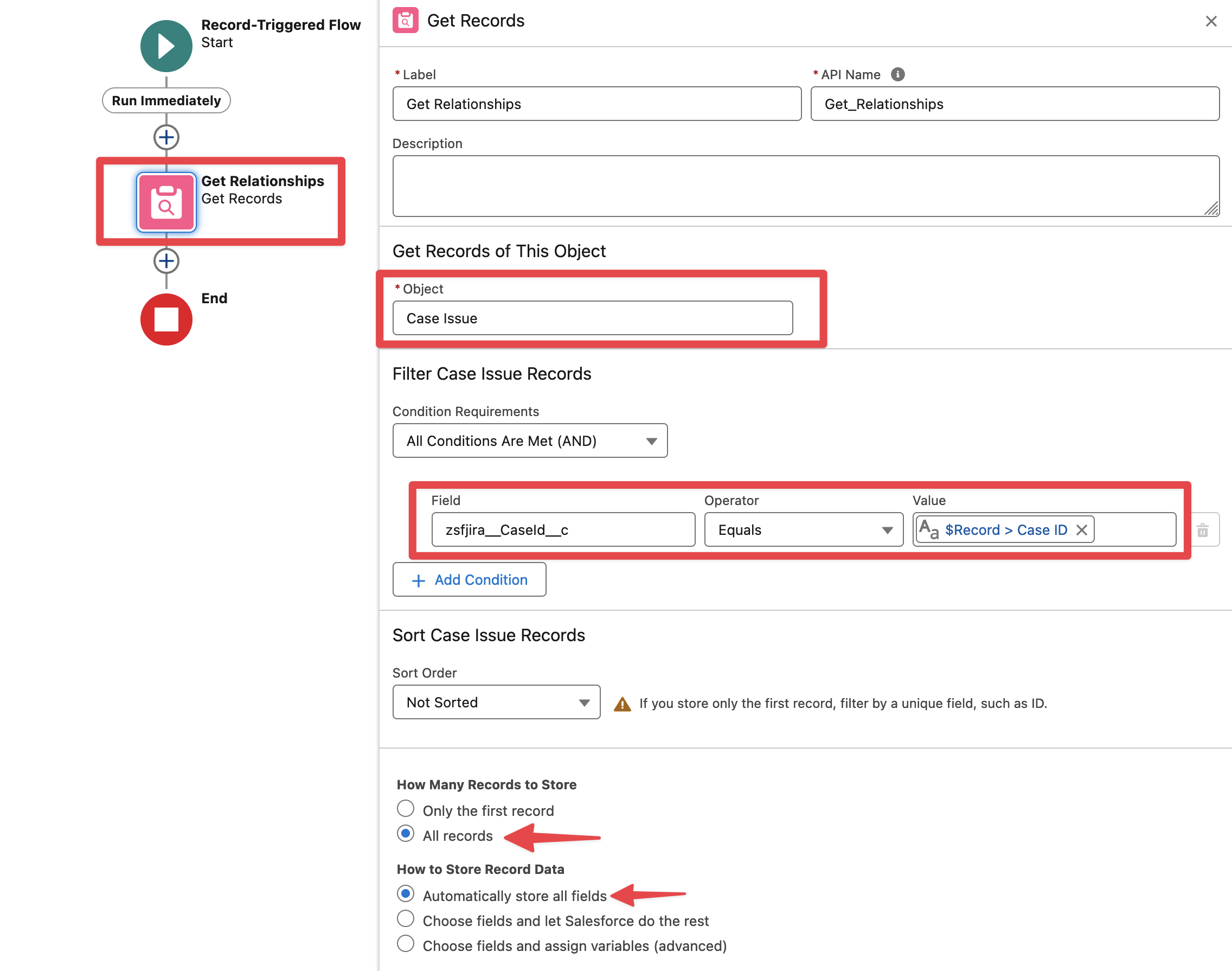 Add a Get Records element to retrieve relationships from the junction object ZIssue_Case