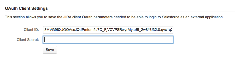 Once you have setup a Connected App in Salesforce, you can copy and paste the Client ID and Client Secret from Salesforce into JIRA via zAgileConnect Add-on admin options (OAuth Client Settings), as shown below, to enable the communication.
