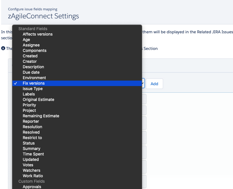 Please note that if you desire to bring JIRA Issue custom fields into Salesforce, you will need to add corresponding fields to the ZIssue custom object with matching field type. Once these custom fields exist in ZIssue, they can be mapped to corresponding JIRA Issue custom fields.