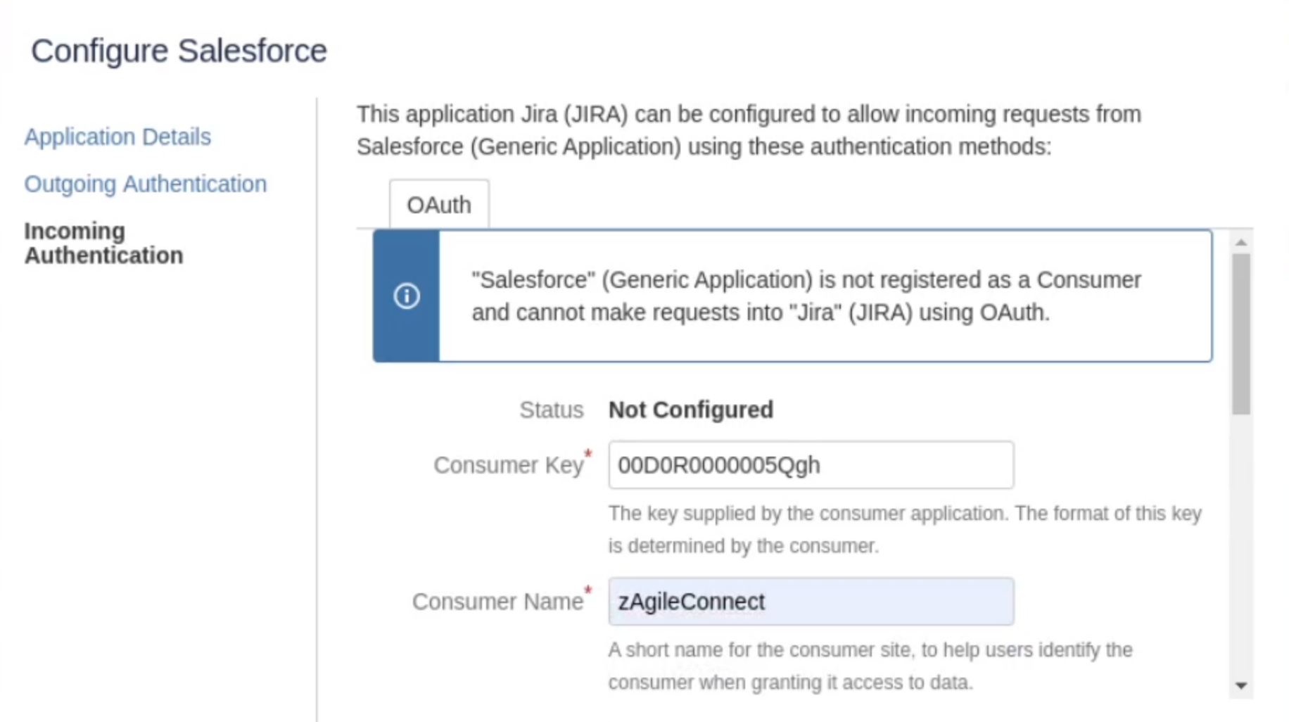 Fill Consumer Key with your Salesforce "Organization Id" (Find your Salesforce Organization Id) and Consumer Name with any name (i.e. zAgileConnect)