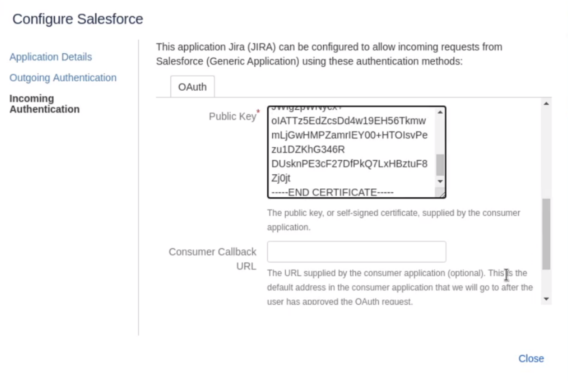 Paste the certificate from Salesforce in the Public Key and Save