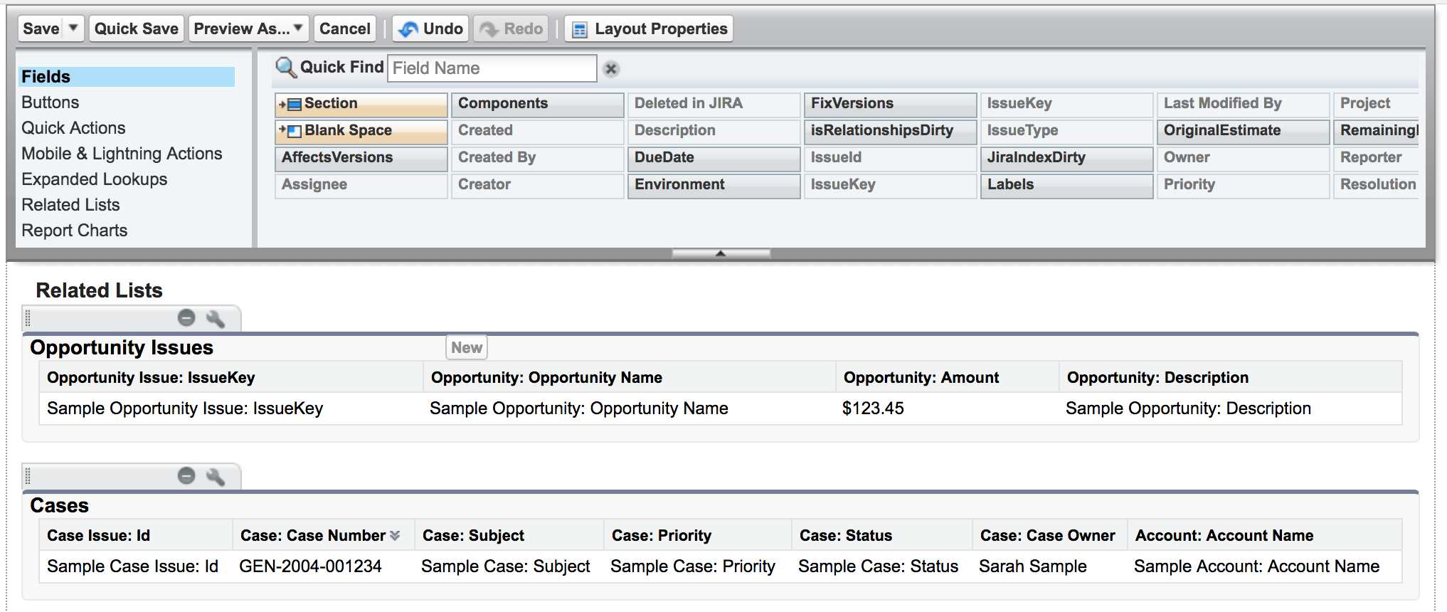 For each object, the field values to display in the Issue Detail Page may be configured, as shown below for Opportunity and Case.
