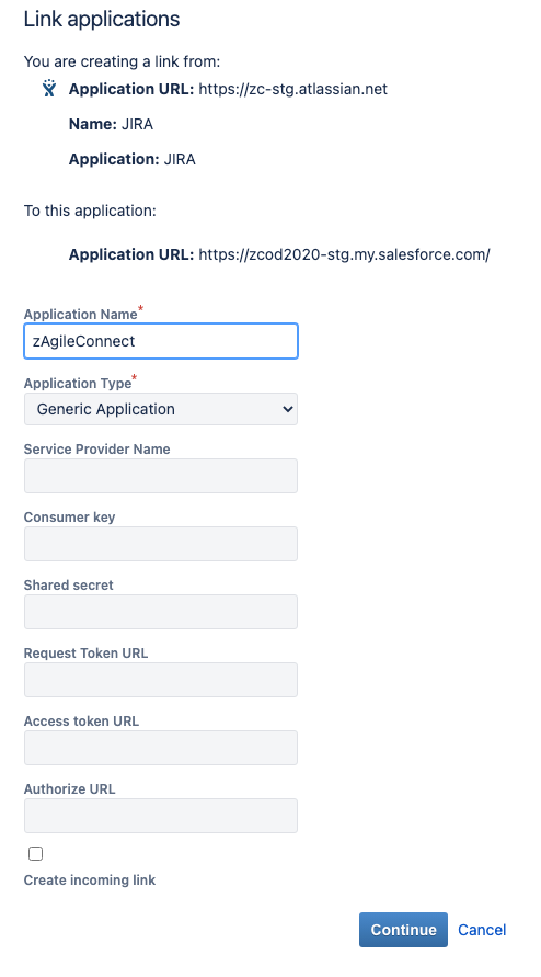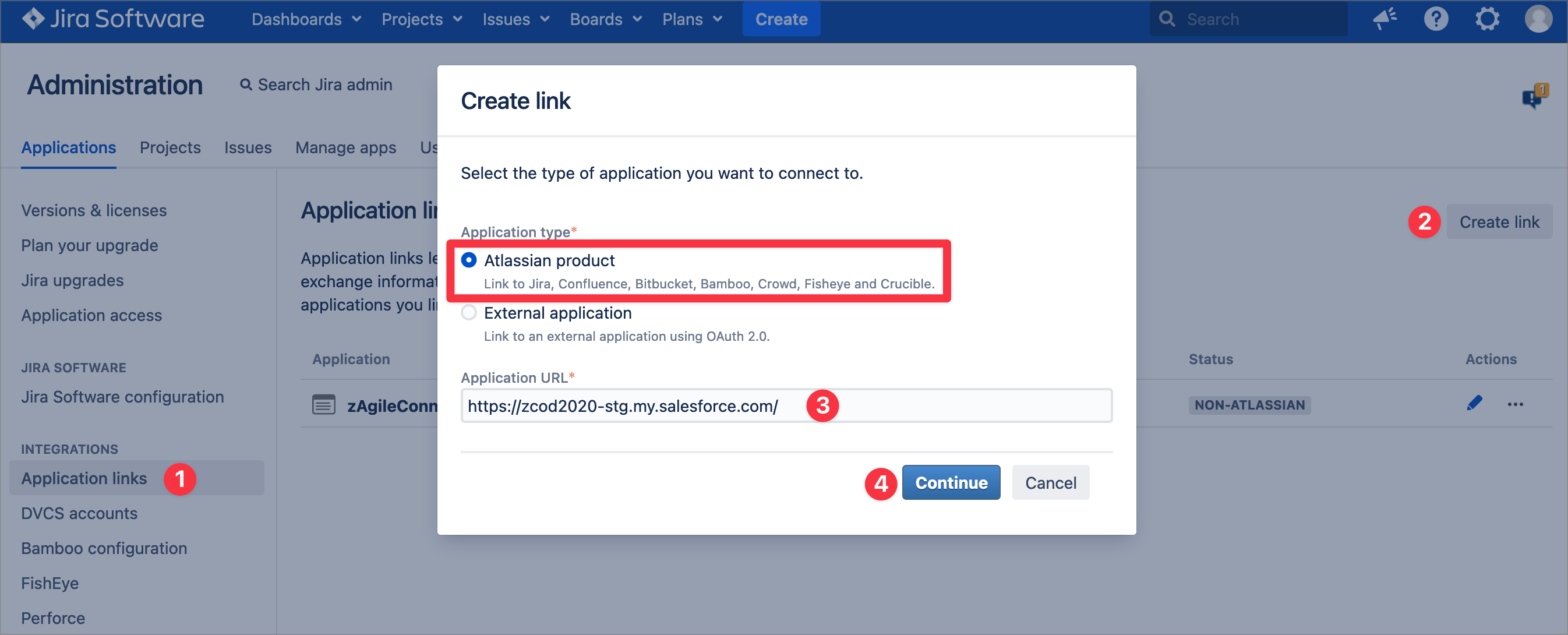 In Jira Administration → Applications → Application Links, create a new link for Salesforce, using the URL of your Salesforce instance (example: https://zcod2020-stg.my.salesforce.com/)