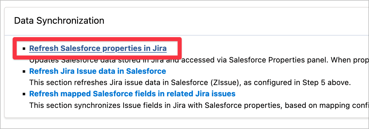 6. Importing Salesforce-Issue relationships from the primary (existing) Salesforce org. This is achieved by running “Refresh Salesforce Properties in Jira” from Salesforce Setup → Installed Packages → zAgileConnect -> Configure.  This step will rebuild existing Salesforce-Issue relationships in Jira.