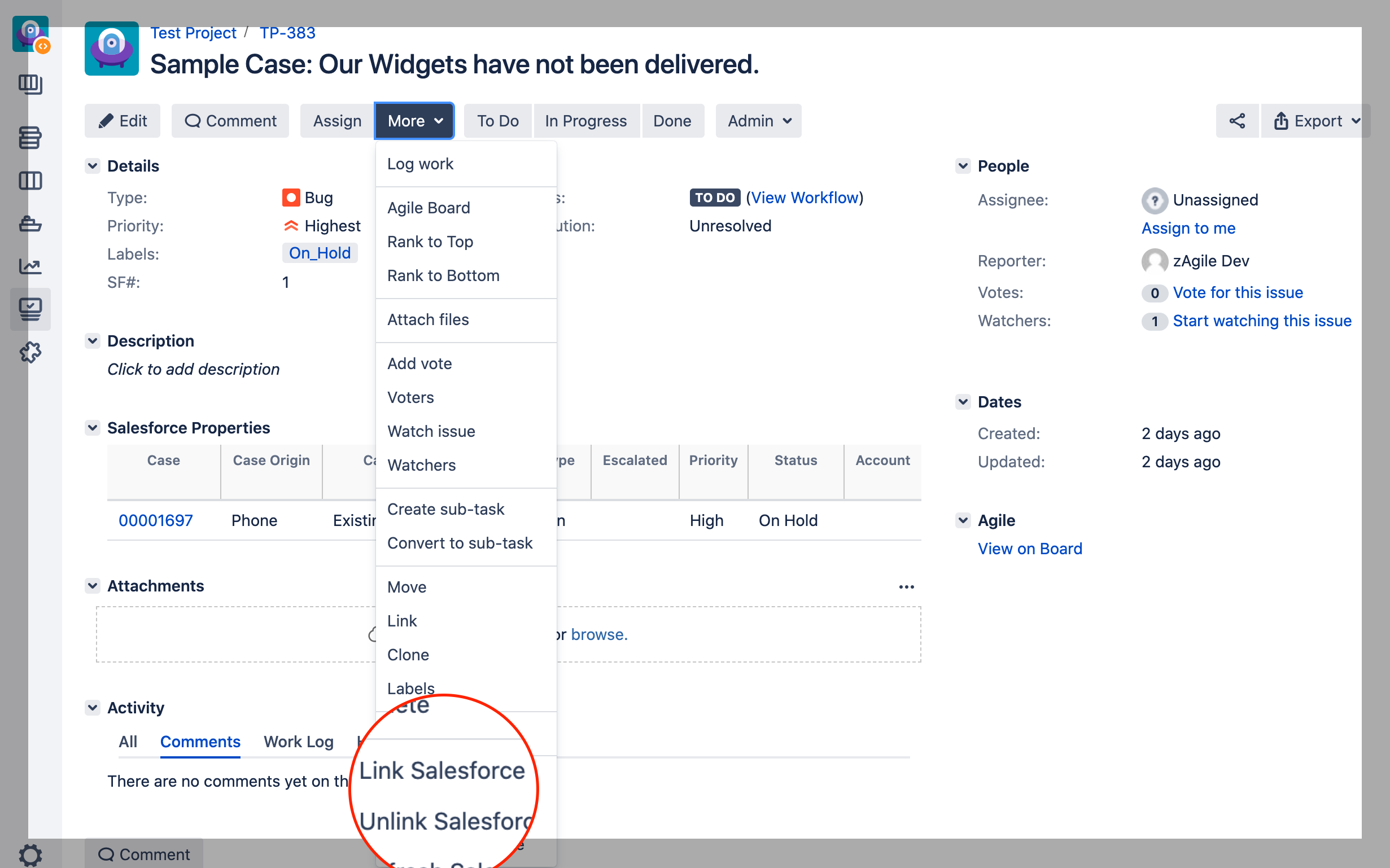 - The object (other than Case) must be configured in zAgileConnect for integration with Jira Issue.