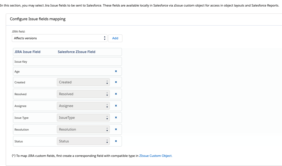 Please note that if you desire to bring JIRA Issue custom fields into Salesforce, you will need to add corresponding fields to the ZIssue custom object with matching field type. Once these custom fields exist in ZIssue, they can be mapped to corresponding JIRA Issue custom fields.