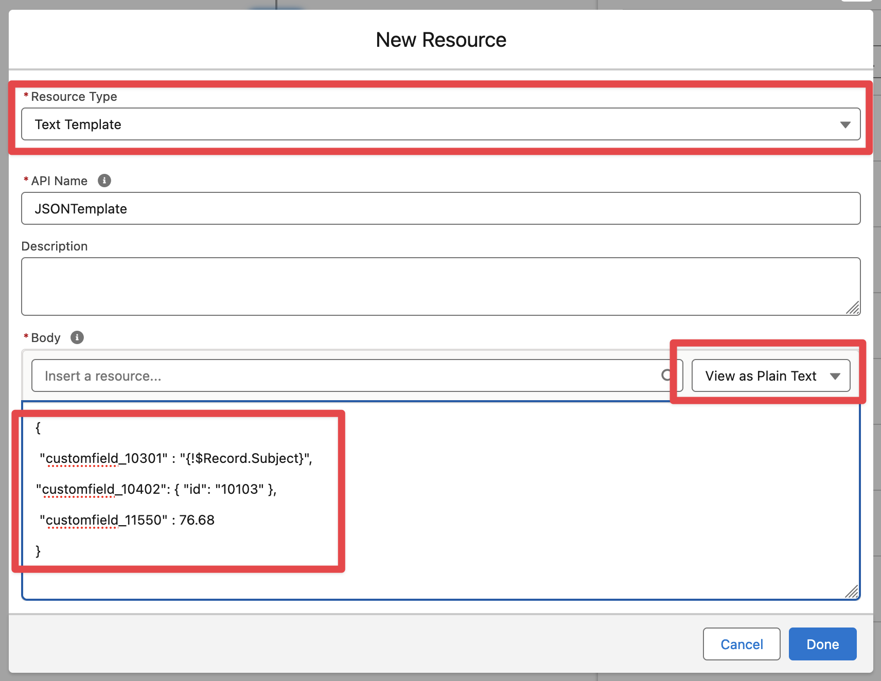 It is also possible pass Salesforce record fields by inserting resources in the text template, for example to pass the Case Subject into the text customfield_10200:
