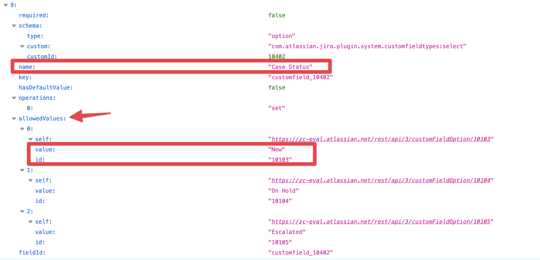 Some field types have allowed values in the metadata, for example for select lists, checkboxes, etc. You need to get the allowed value Id in order to pass it to Jira. In the example below there is a Select List (single choice) Jira custom field called “Case Status”, with 3 allowed values (New, On Hold, Escalated), to pass the “New“ value to Jira for Issue creation you need to grab and use the Id “10103“.
