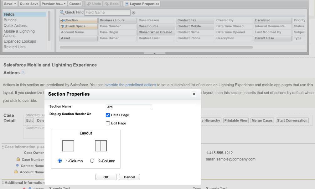 The final step in this setup before turning this capability to Support teams involves adding a Visualforce page (Related JIRA Issues) to the Case page layout from where users will interact with JIRA.  To achieve this,
