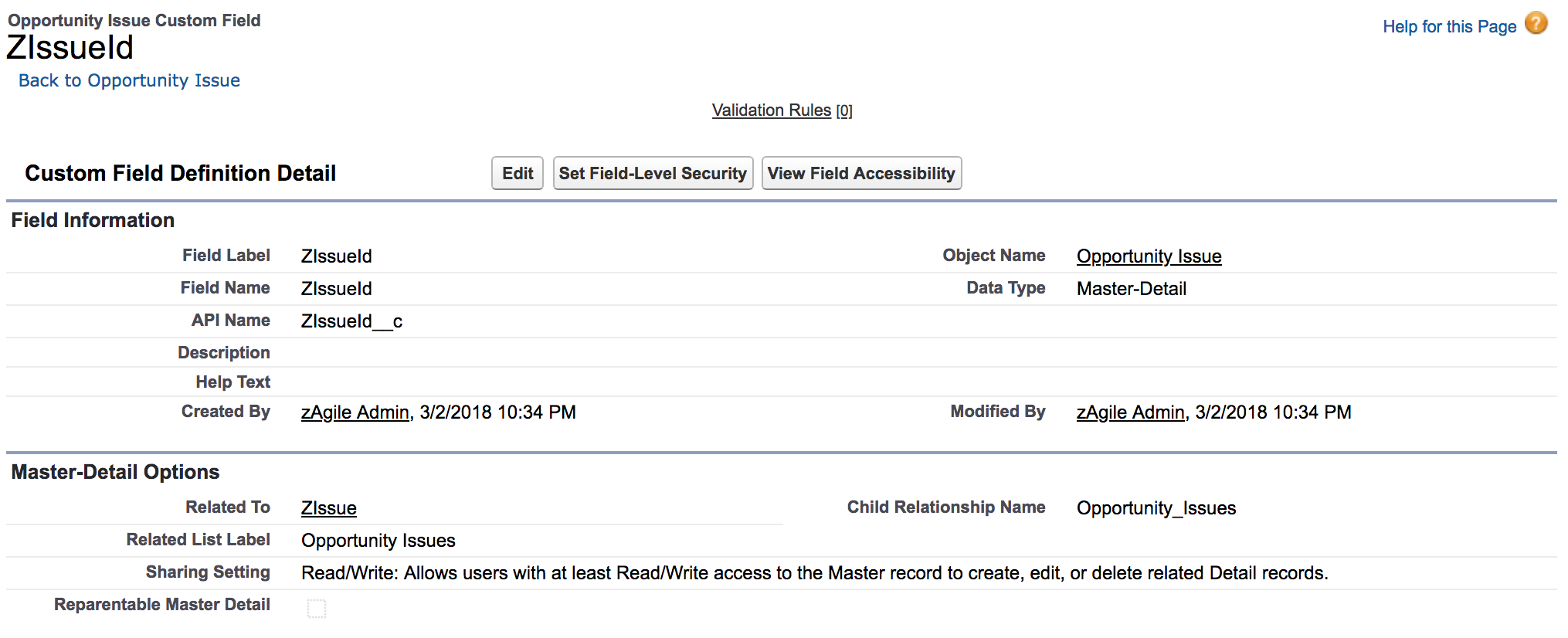 Next, we define a Master-Detail relationship with ZIssue.