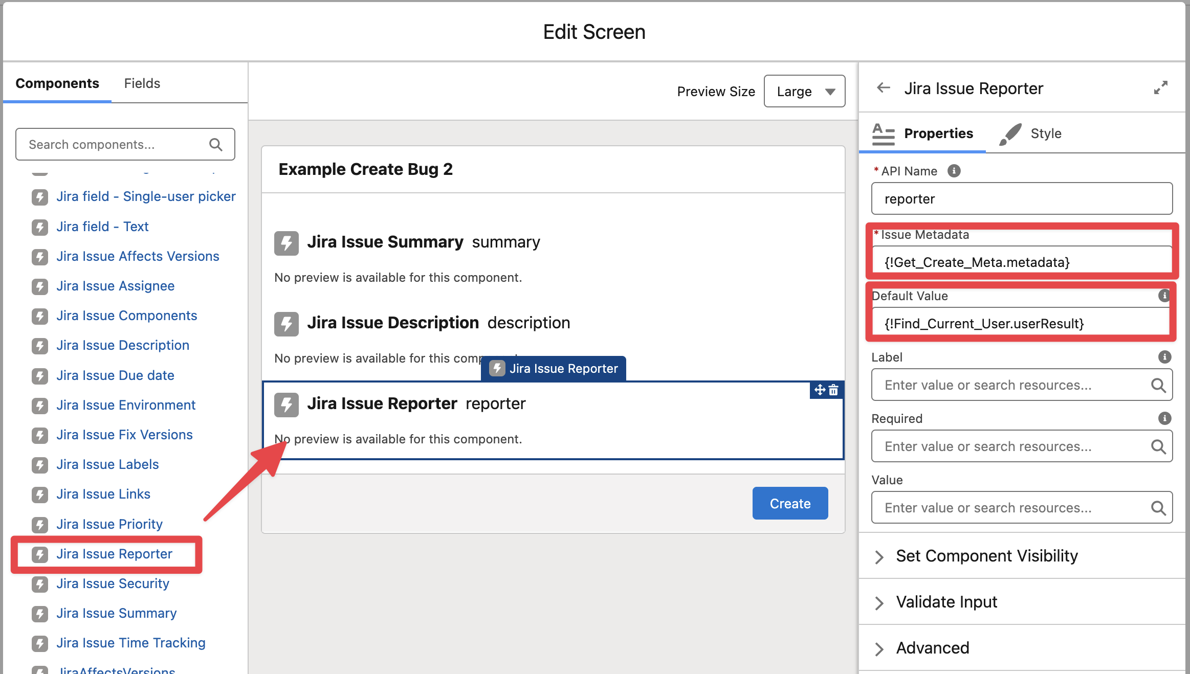 Edit the “Create Bug Screen“ element in the Flow and add the “Jira Issue Reporter“ component, pass the output of the Get Create Metadata (as in any other field component) and the output of the Find Jira Users to the Default Value.