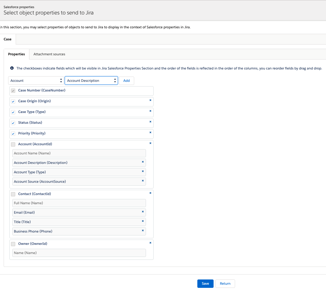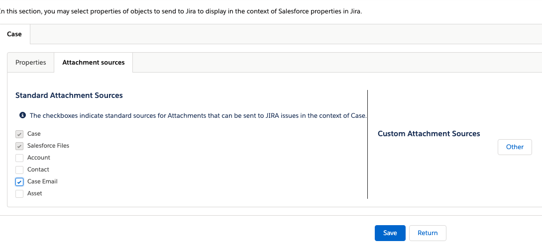 In this section, you can select the properties related to Case and other configured Salesforce objects that you want to send to JIRA for display within the issue context.  The metadata associated with these properties will be sent to JIRA upon saving.  Subsequently, when a JIRA Issue is created from Salesforce, values corresponding to these properties are sent to JIRA for associating (and displaying or copying) with the Issue.