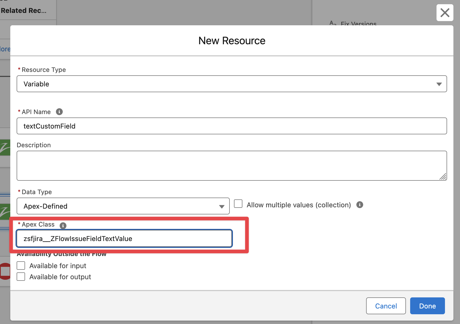 Jira Issue custom fields can be set using the Custom Fields field. This fields expects a collection of ZFlowCustomField, for each Jira type of custom field there is corresponding Apex-Defined class. One required field to build a custom field variable in the flow is the custom field Id (starts with customfield_). To find the custom field Ids use the following REST API provided by Atlassian: