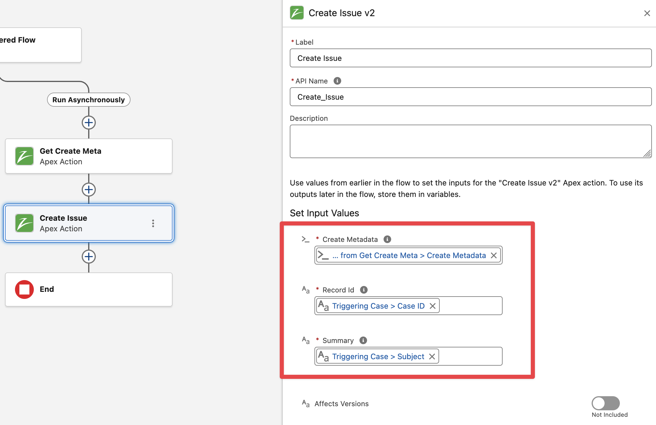 You can create an Issue by using Salesforce Flow and adding the “Create Issue v2“ action to your flow. The action has the following fields: