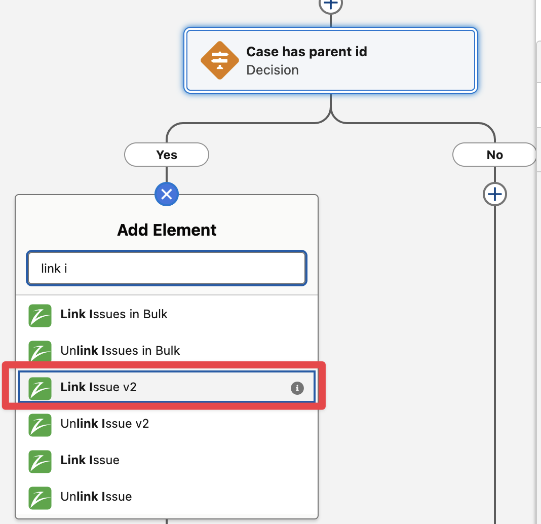 From “Yes” outcome, add the “Link Issue v2” Flow Action