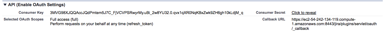 Define an entry for JIRA Connected App in Salesforce->Setup->Create->App (Connected App section) with key parameters as shown below: