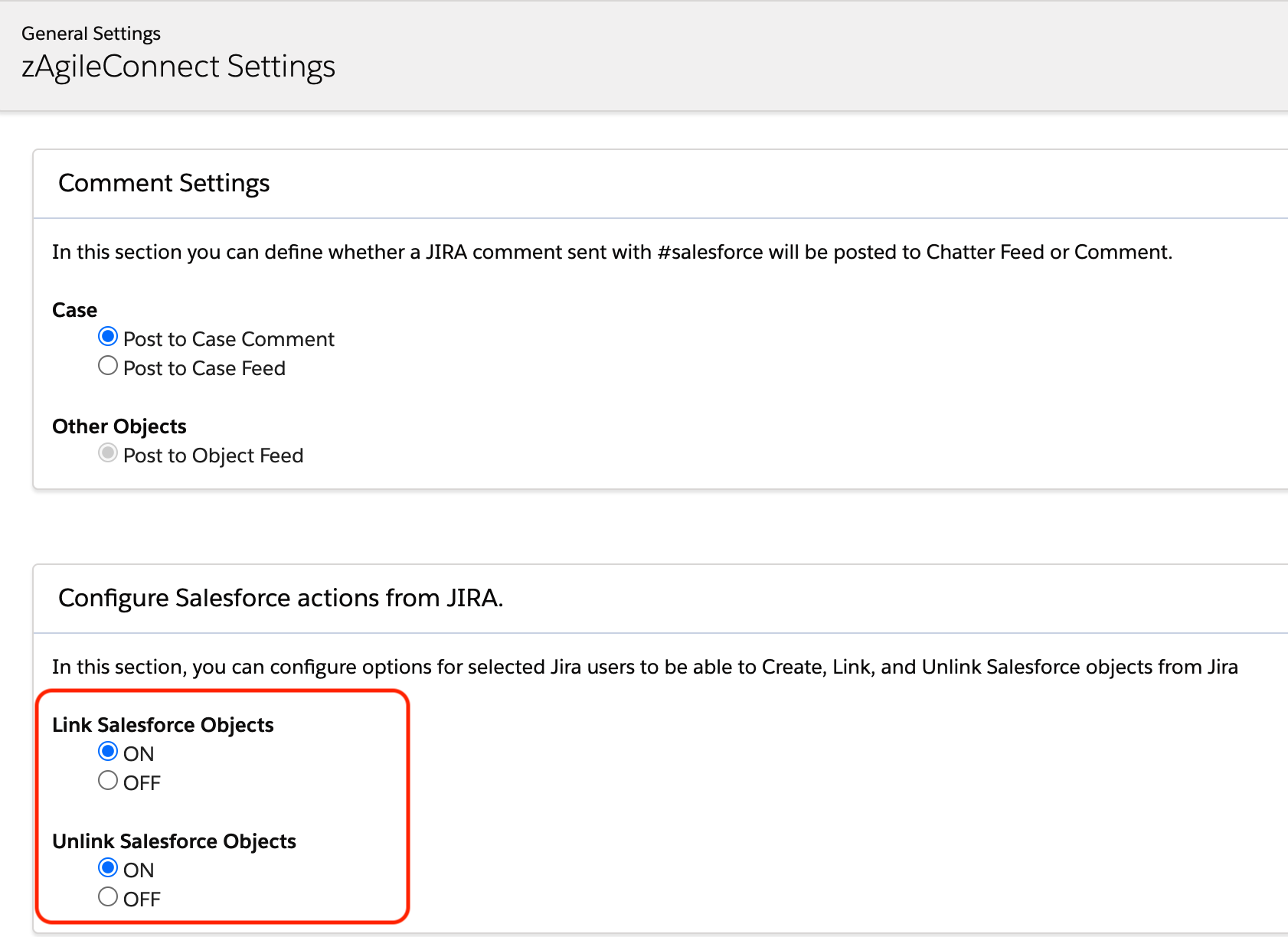 In General Settings option of zAgileConnect Salesforce package, enable Link and Unlink Actions to allow Jira users to link or unlink Jira Issues with Salesforce objects.  This option applies to all Salesforce objects that have been configured for integration with Jira Issues.  Specific objects for Linking and Unlinking are selected subsequently in Jira.