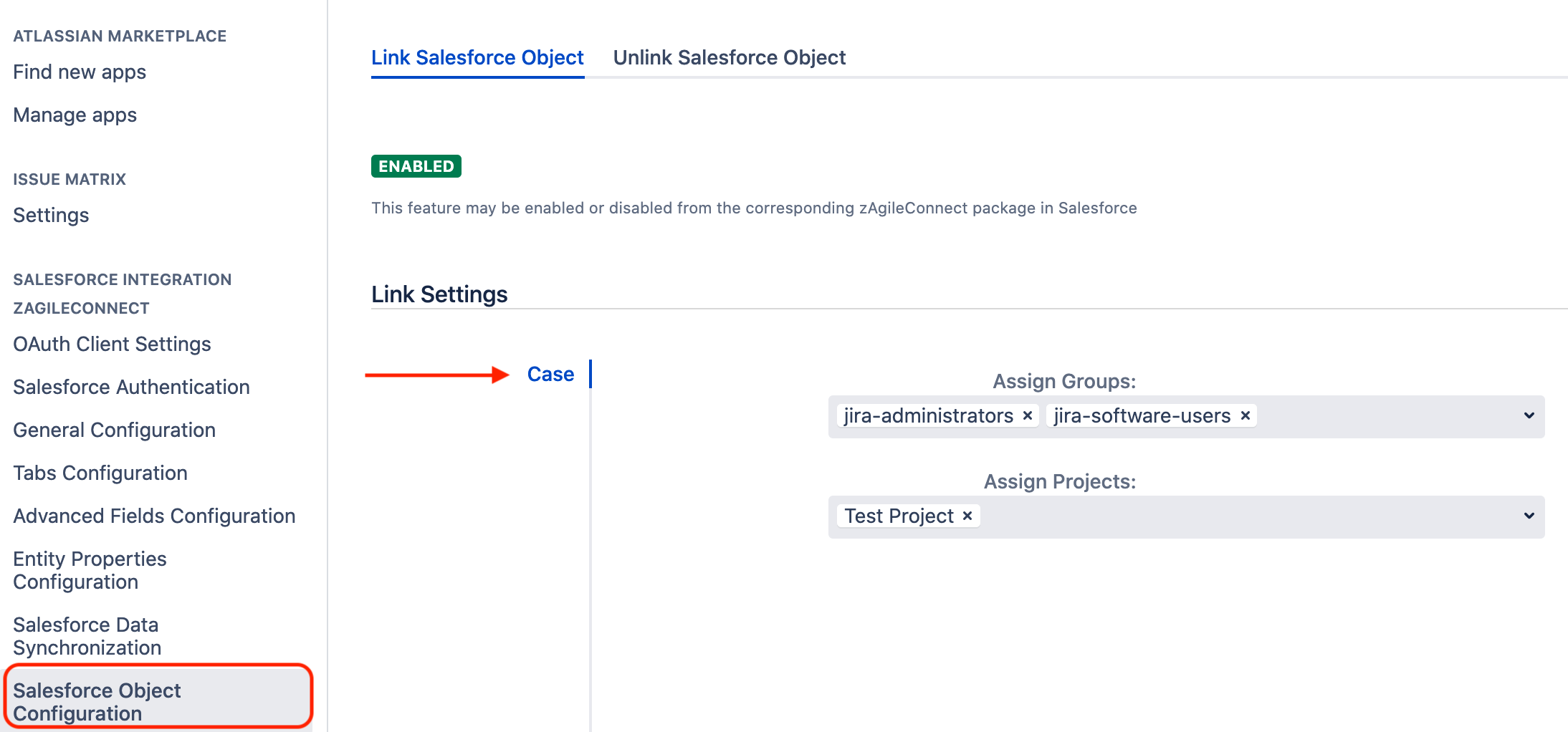 Salesforce Action (Link and Unlink) are enabled for specific Jira Groups and Projects through assignments in this configuration.