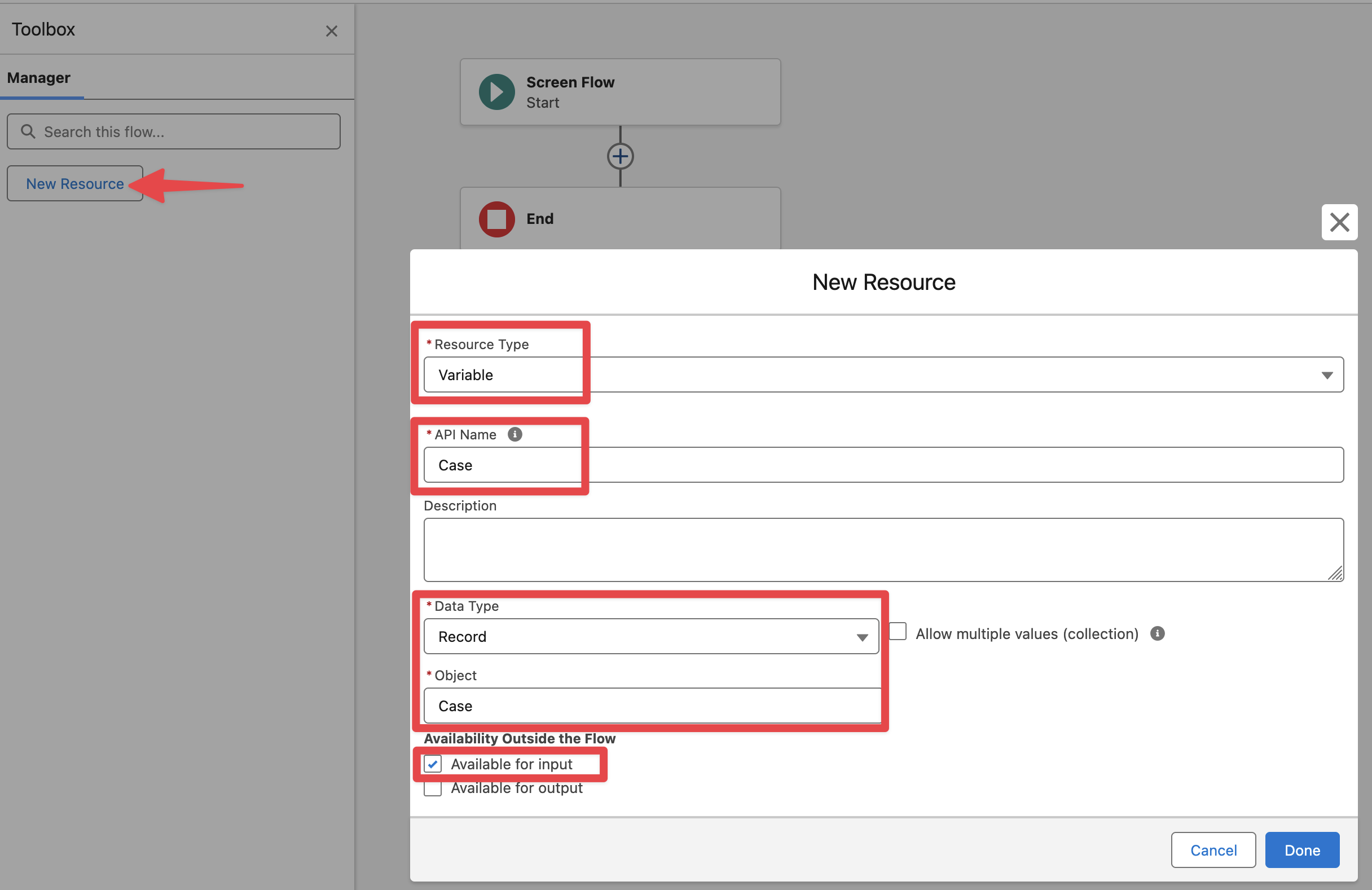 In the Toolbox add a new Resource Variable to receive the Case record