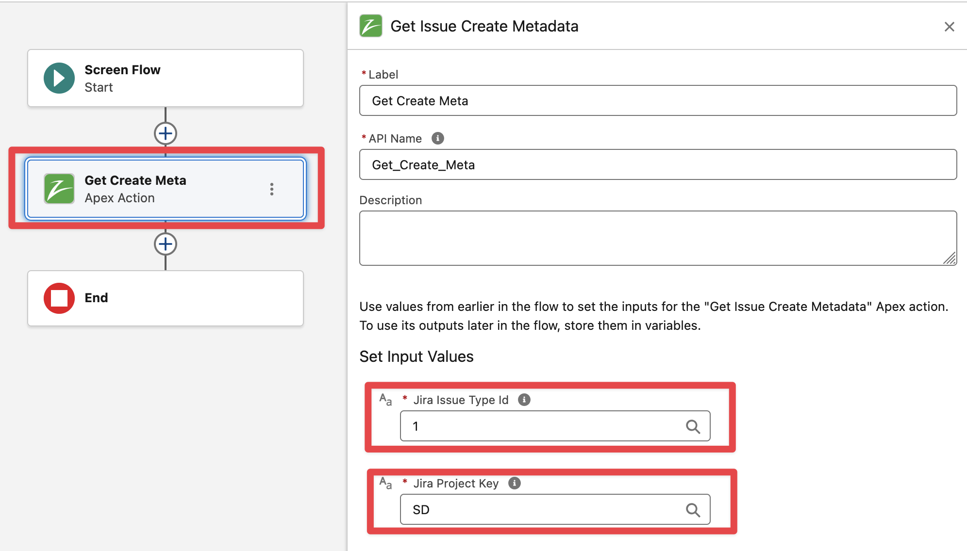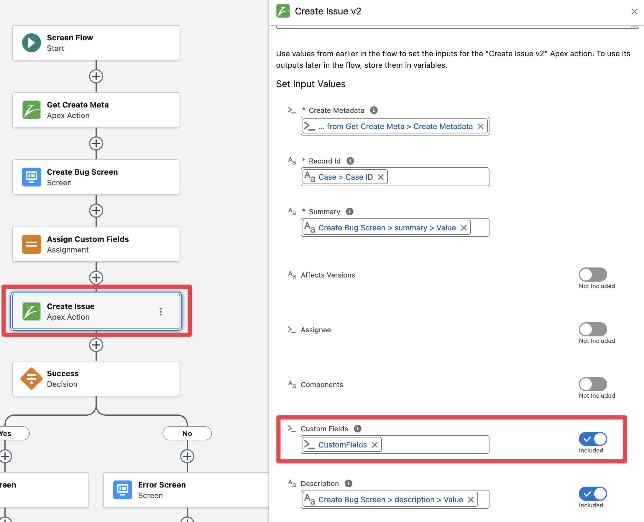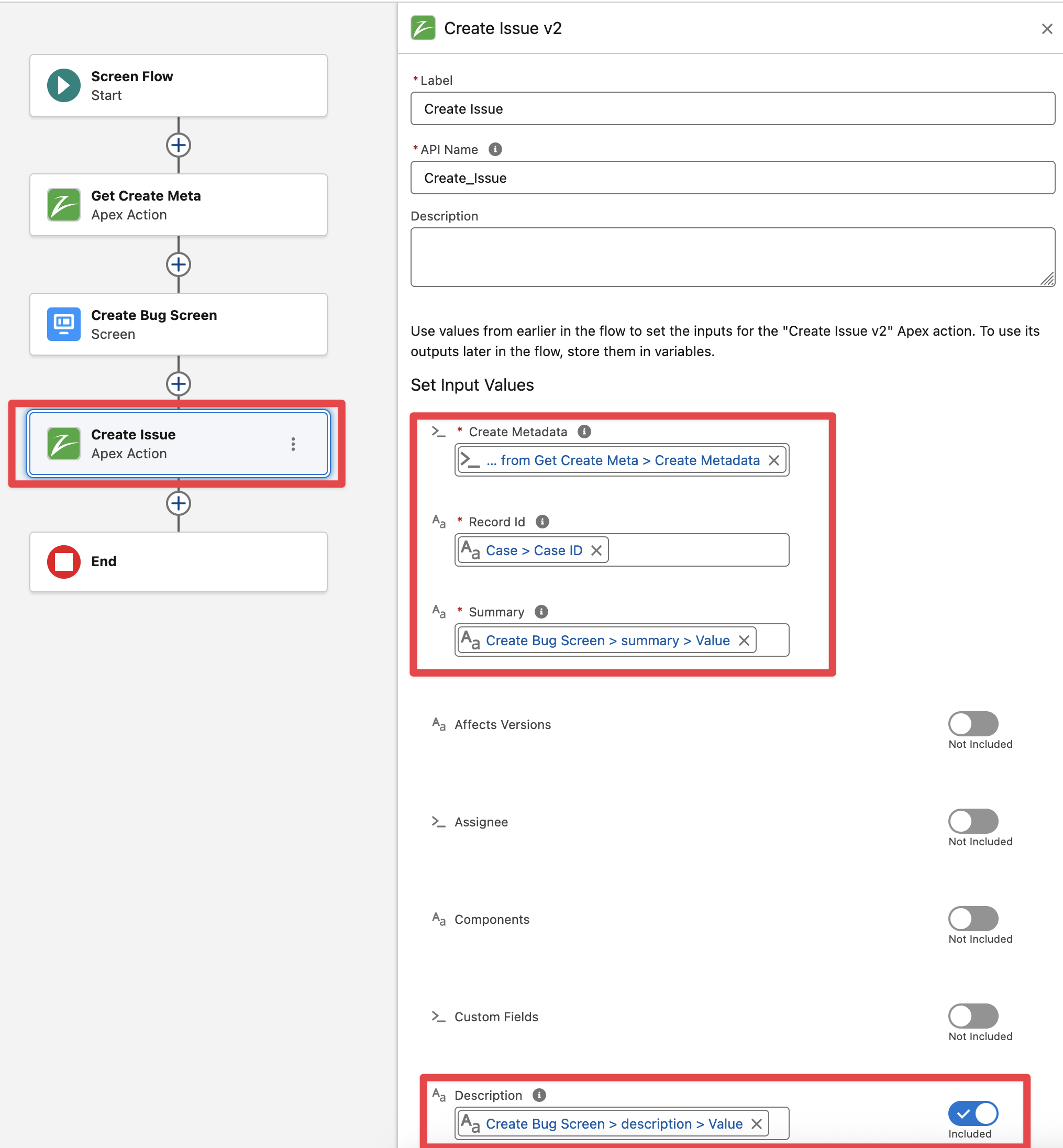 Add the “Create Issue v2“ flow action and pass the required Create Metadata (output from the Get Create Metadata action), Case Id (from Case record input variable) and Summary / Description fields (from the Screen components)