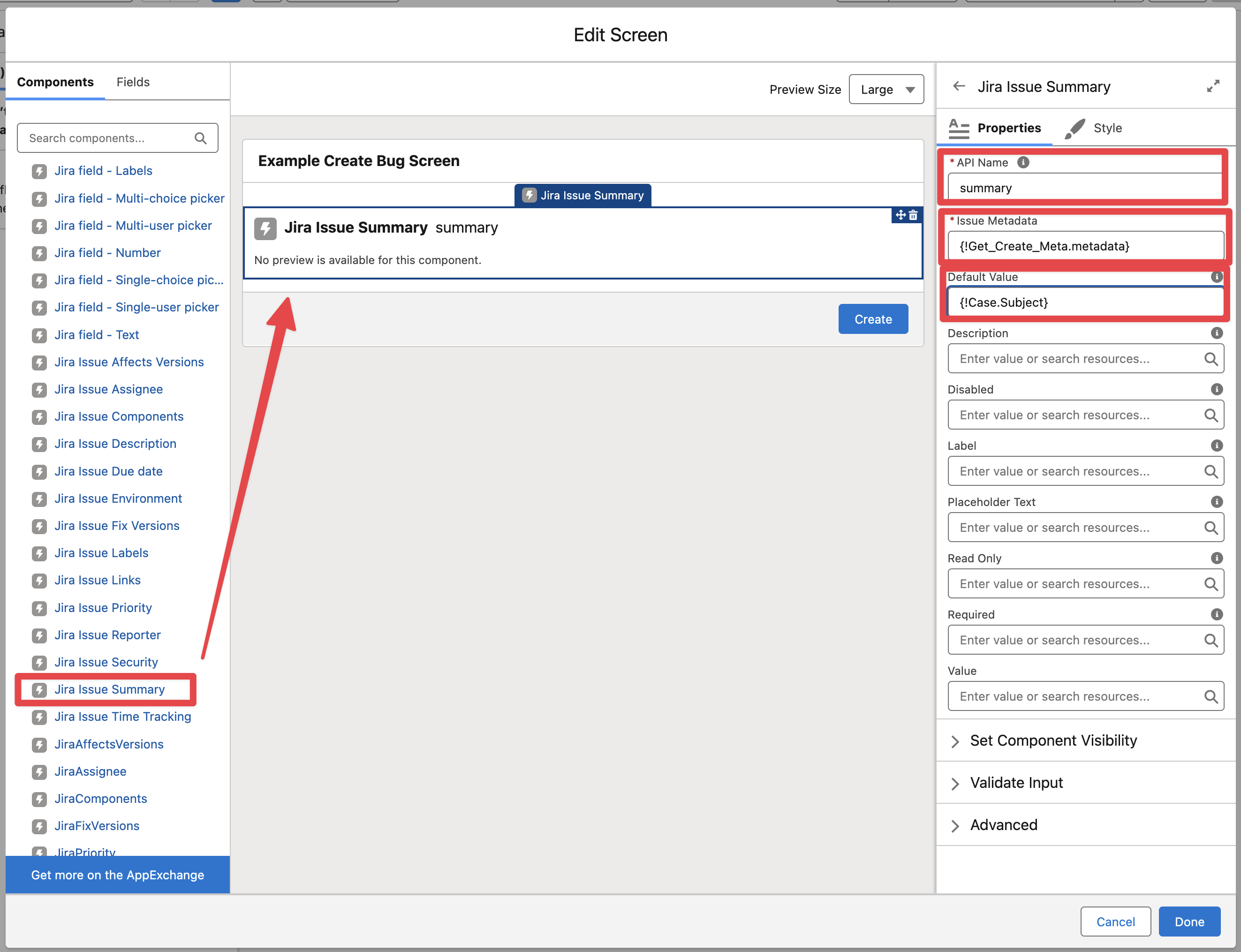 Drag and drop the “Jira Issue Summary“ component and pass the Create Issue Metadata retrieved before, also it is possible to map the default summary value to the Case Subject