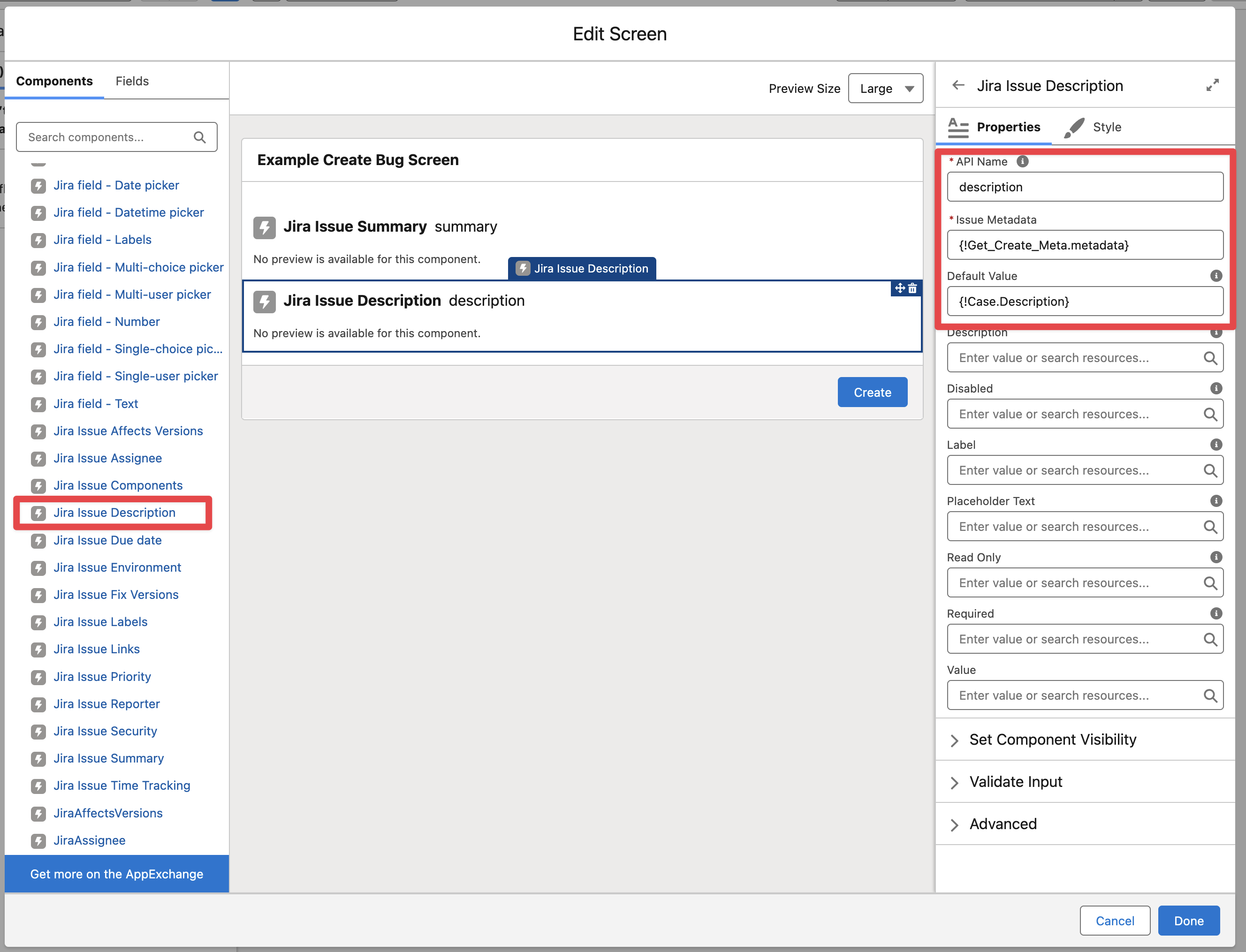 Add the “Jira Issue Description“ component in the same way and click on Done to finish modifying the screen