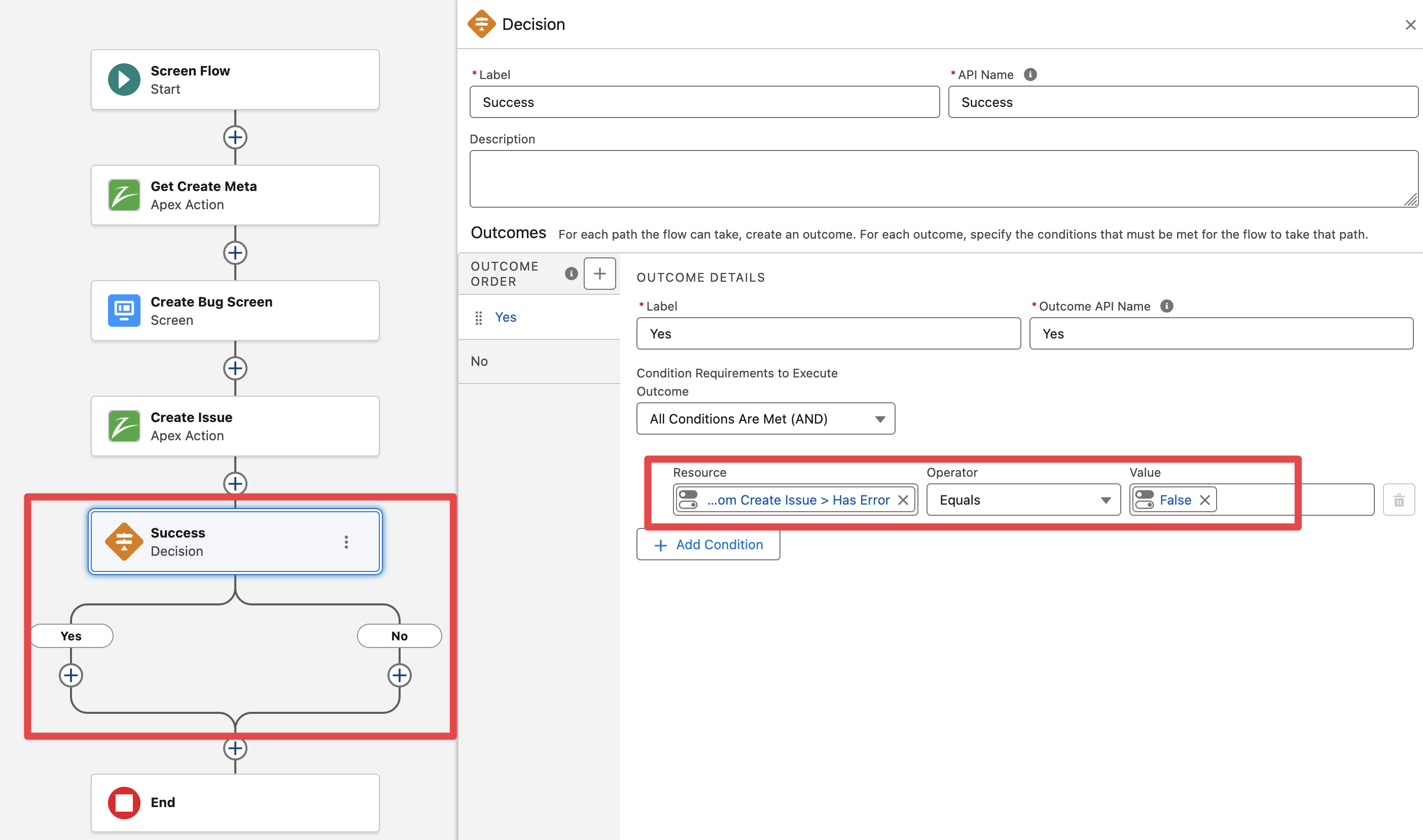 It is recommended to handle any error that may occur during Issue creation, for that we can validate the output of the “Create Issue v2” flow action with the addition of a “Decision” element