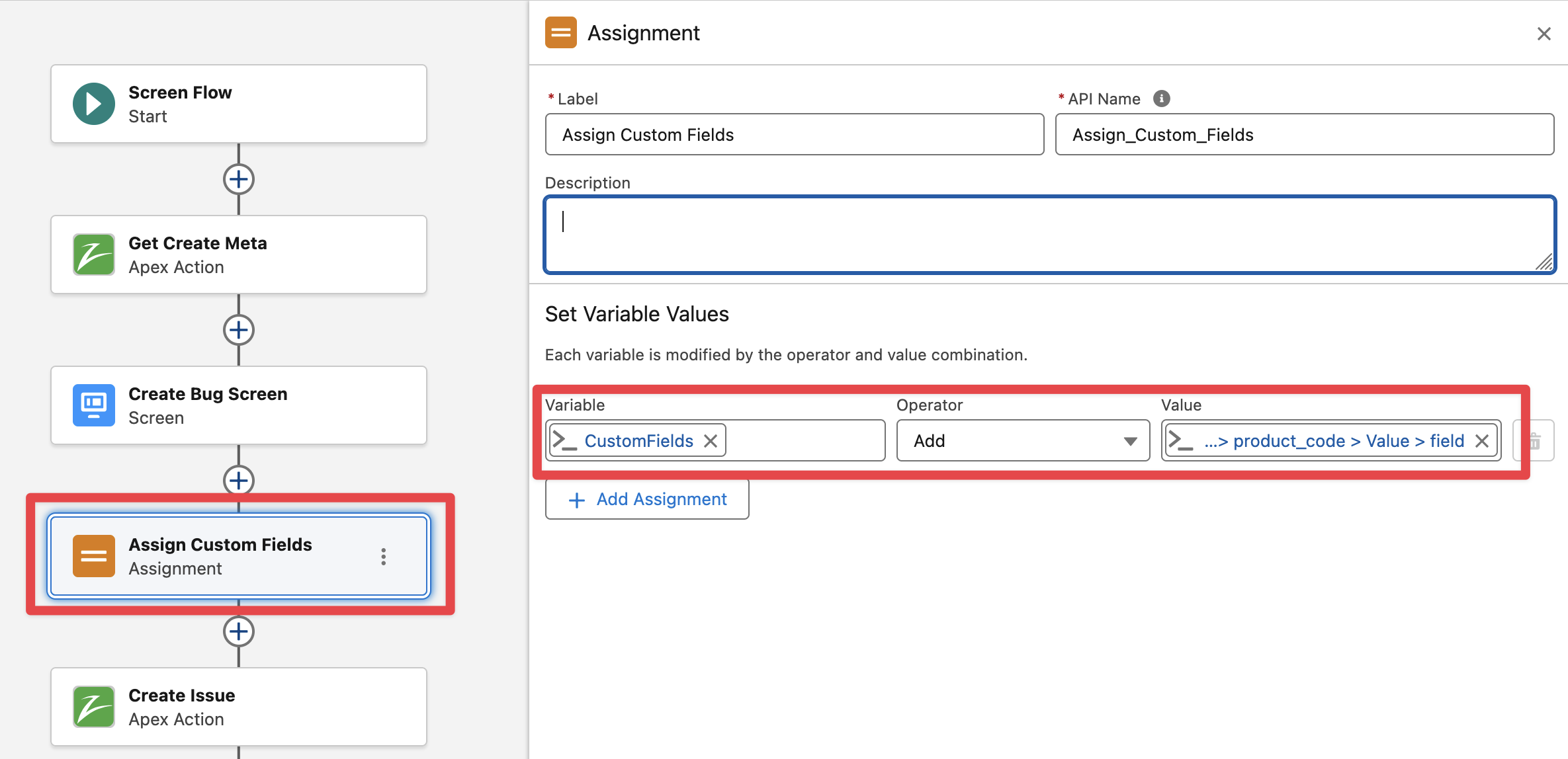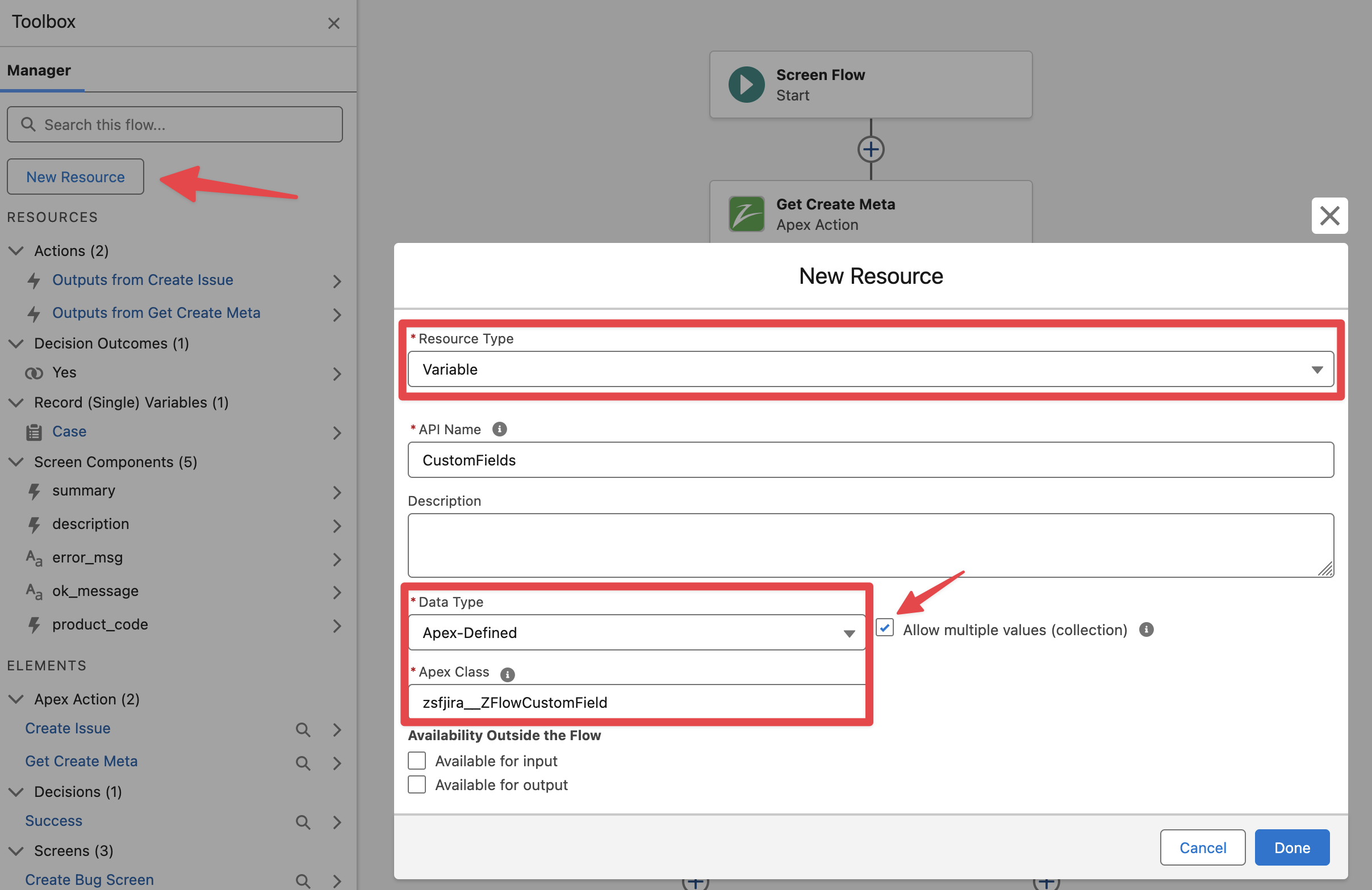 Add a New Resource Variable (collection) for the “ZFlowCustomField“ Apex-Defined type, this collection is always needed to group all custom fields that will be passed to the “Create Issue v2” action