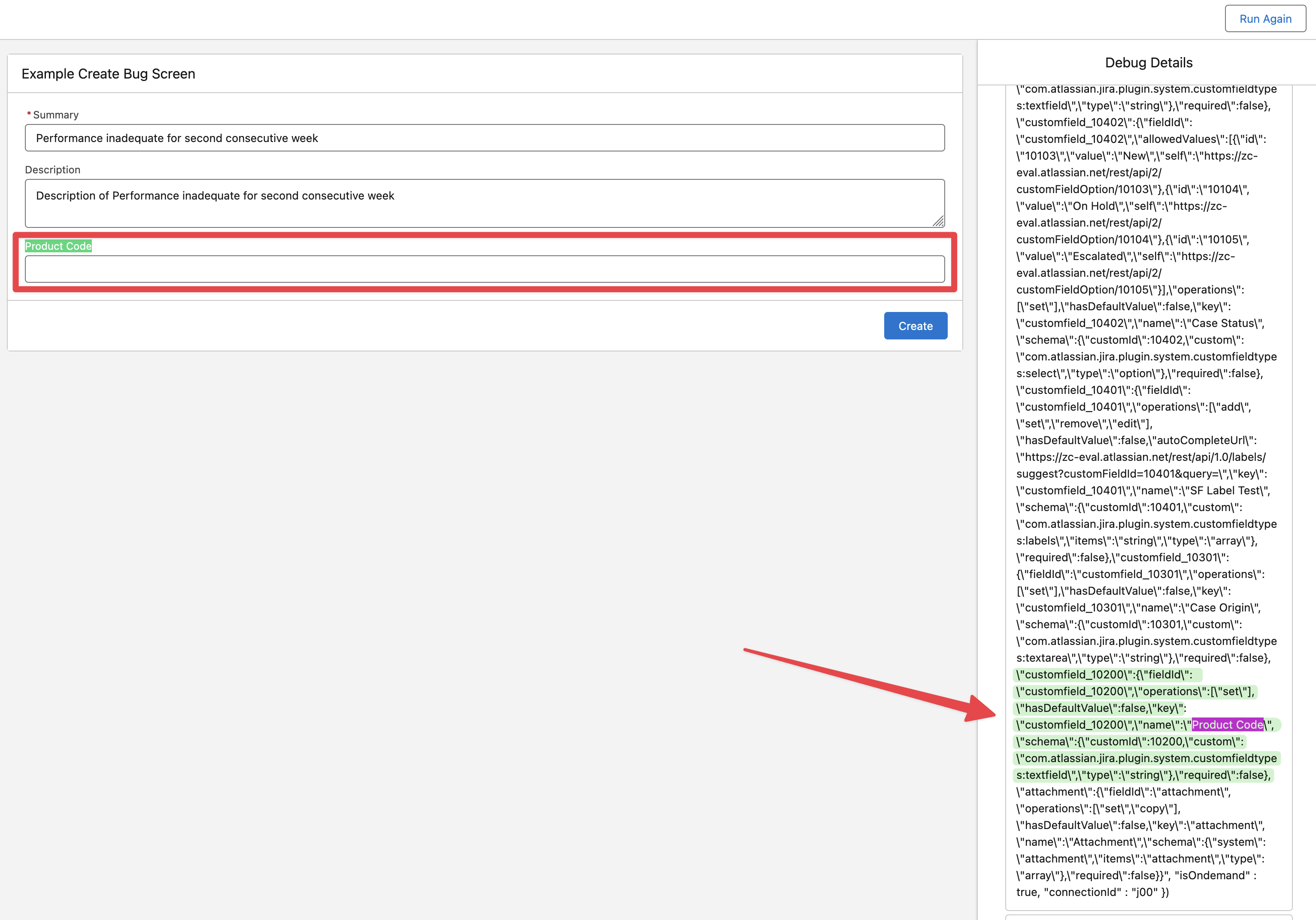 Assuming there is a custom text field defined in Jira (Product Code in our example) and associated with the Bug Issue type (see the “Settings Custom Fields Data“ section in zAgileConnect Flow Action - Create Issue v2 | Setting-Custom-Fields-Data for more information on how to know the custom field Id for any Jira field).