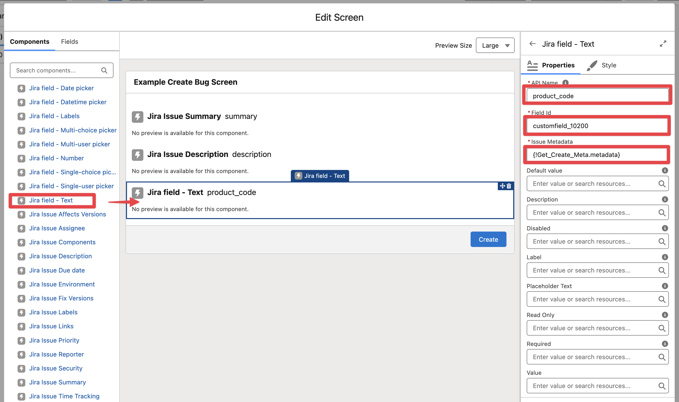 Edit the “Create Bug Screen“ element in the Flow and add a “Jira field - Text“ component, pass the output of the Get Create Metadata (as in any other field component) and set the Jira custom field Id for Product Code.
