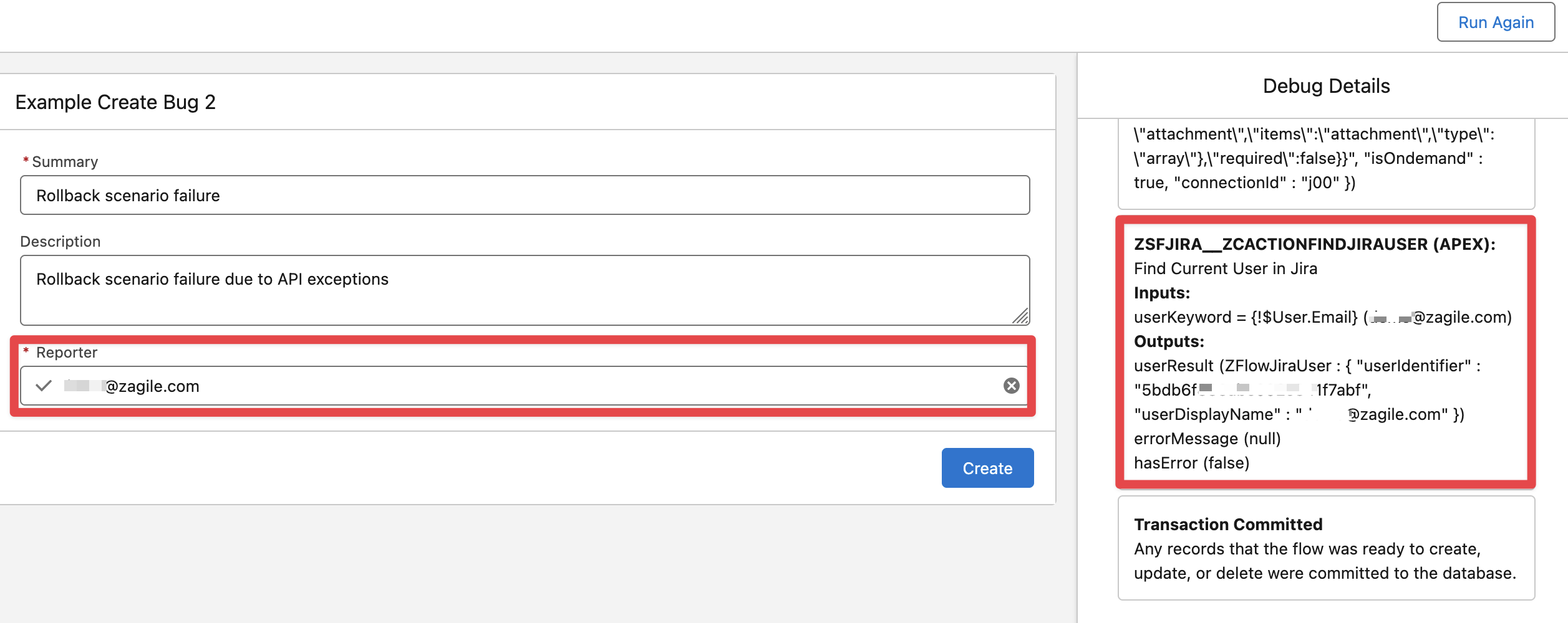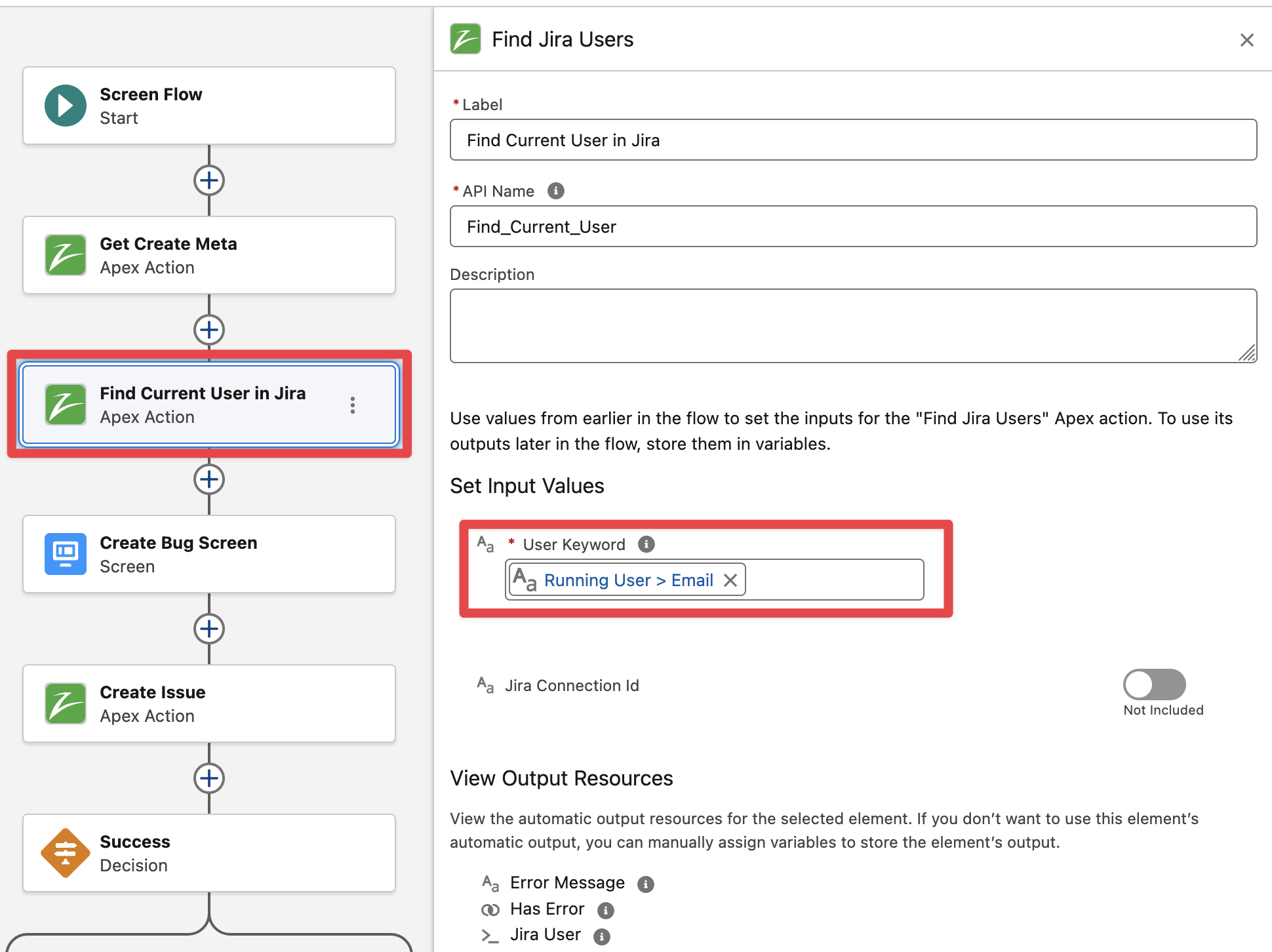 Finally Save and Activate the flow. Run the flow in Debug mode and validate the “Find Jira Users“ action has found an Account in Jira for your Salesforce user email address