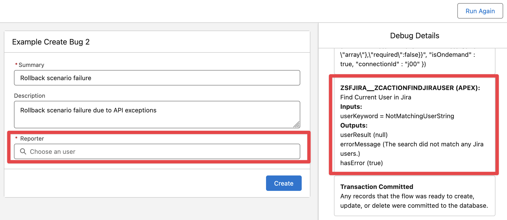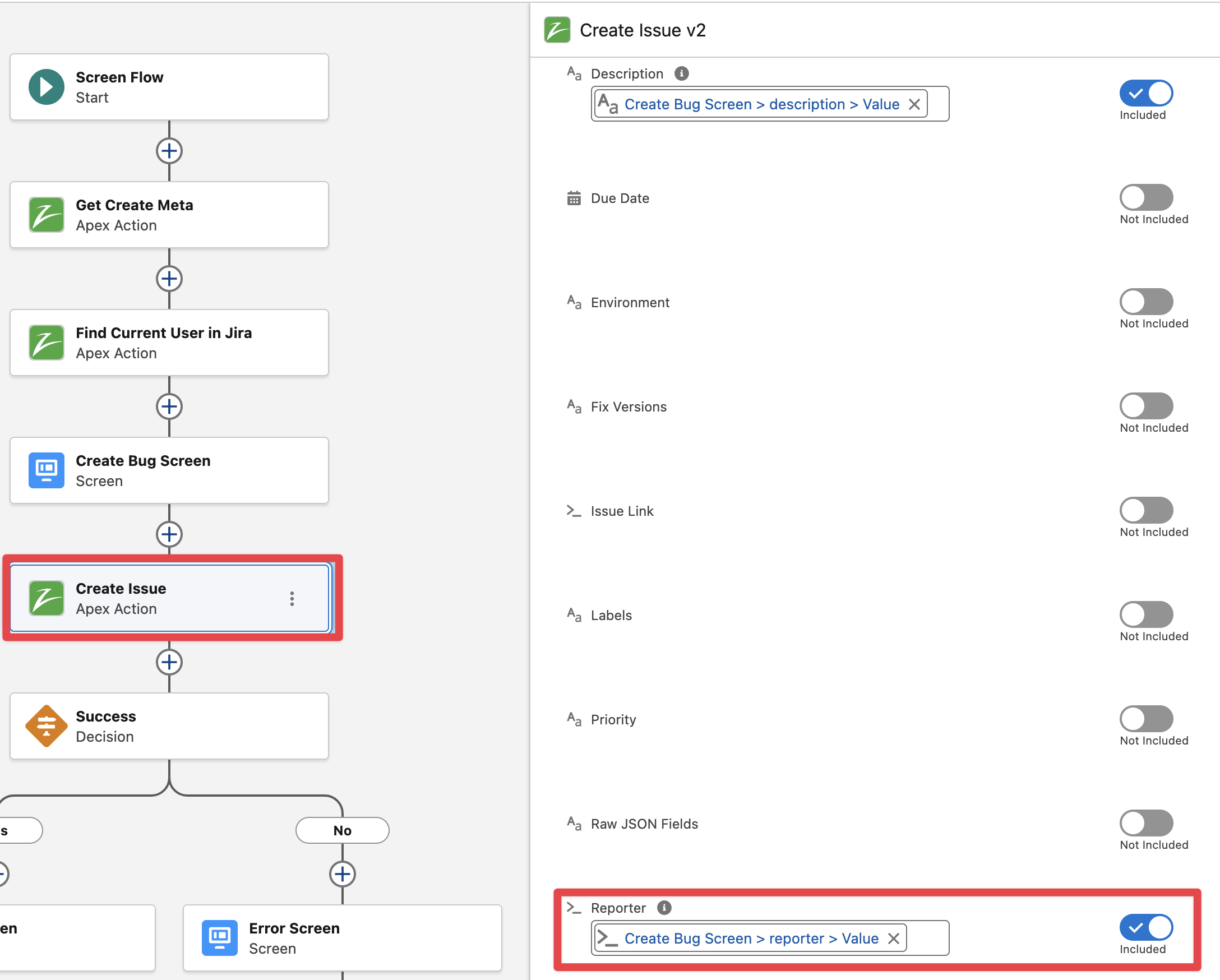 Edit the “Create Issue v2“ action and pass the “Reporter” field (from the Screen Component Value, this will allow the Salesforce users to see the default reporter as the current user but let them select a different reporter for creating the Issue)