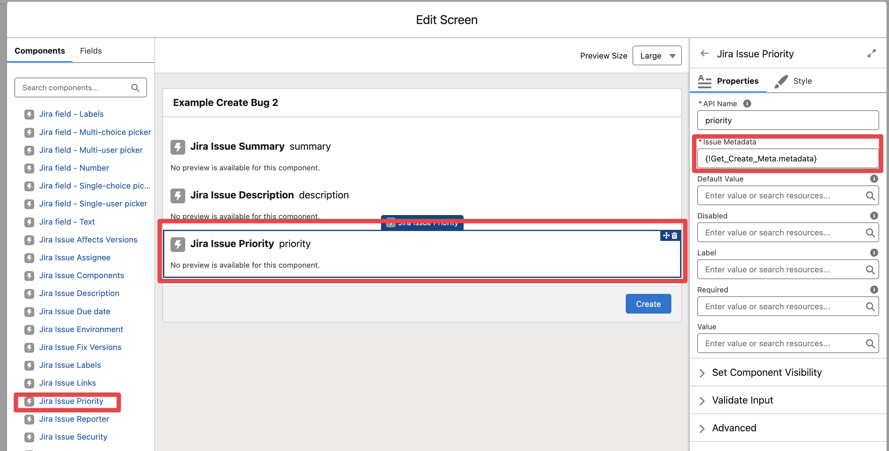Edit the “Create Bug Screen“ element in the Flow and add the “Jira Issue Priority“ component, pass the output of the Get Create Metadata (as in any other field component)
