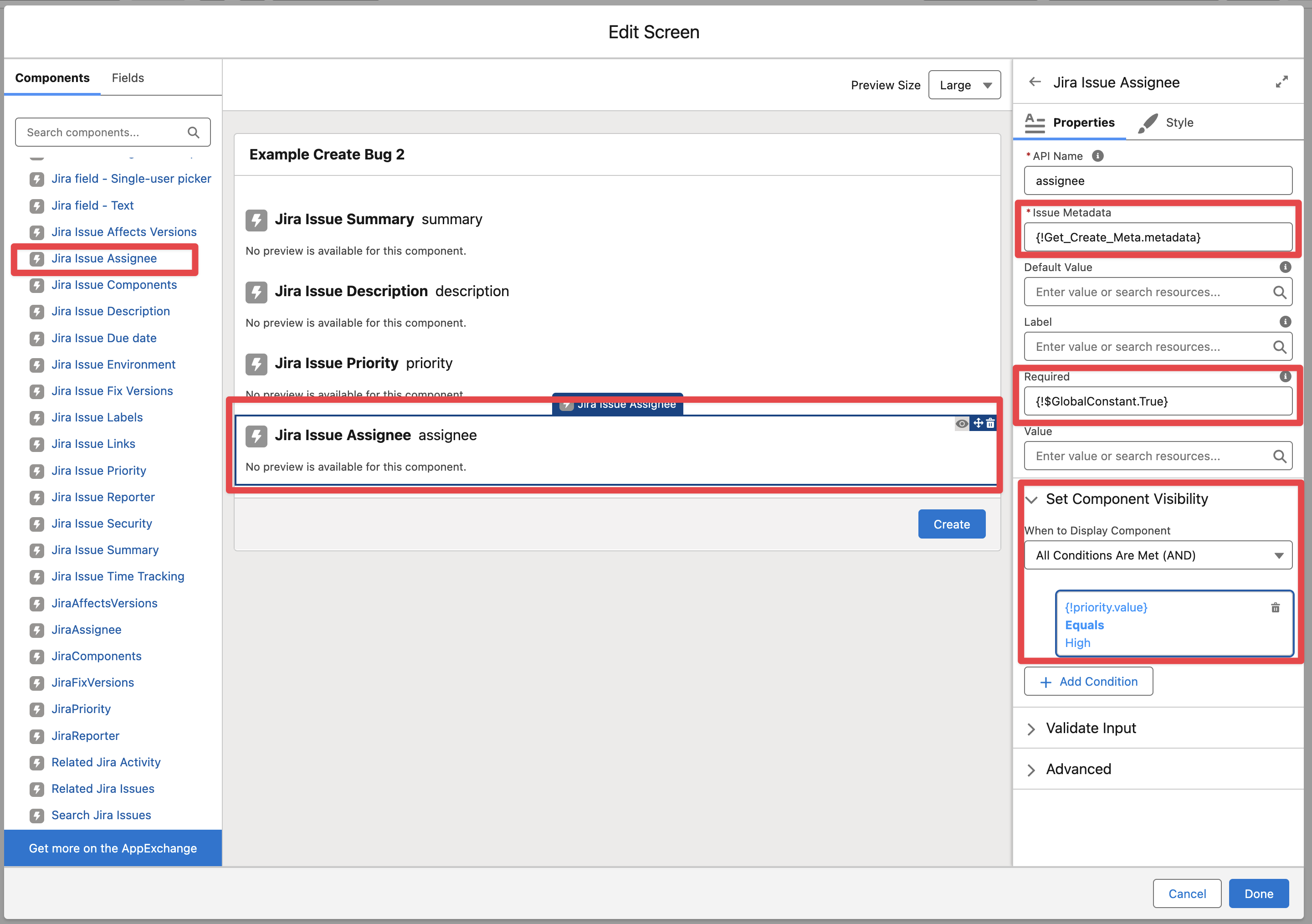 Add the “Jira Issue Assignee“ component, pass the output of the Get Create Metadata, make the component required and set component visibility to only render when priority.value = High