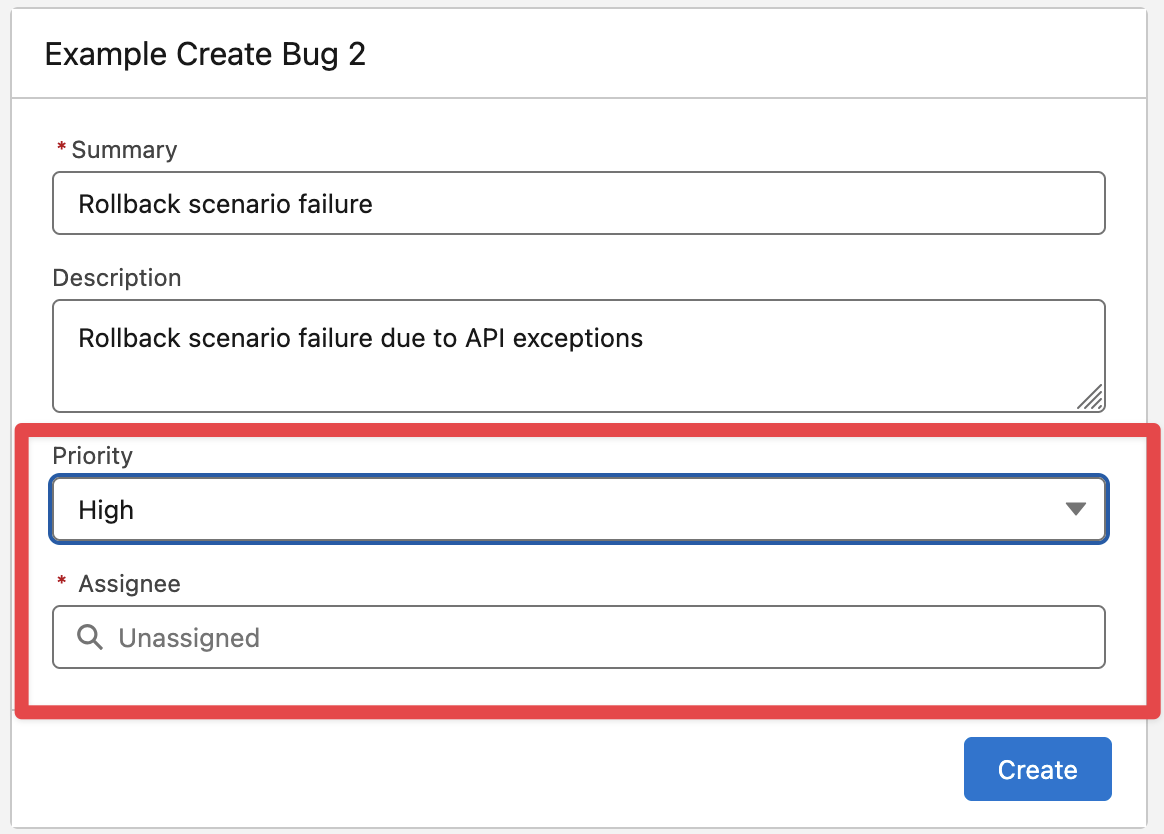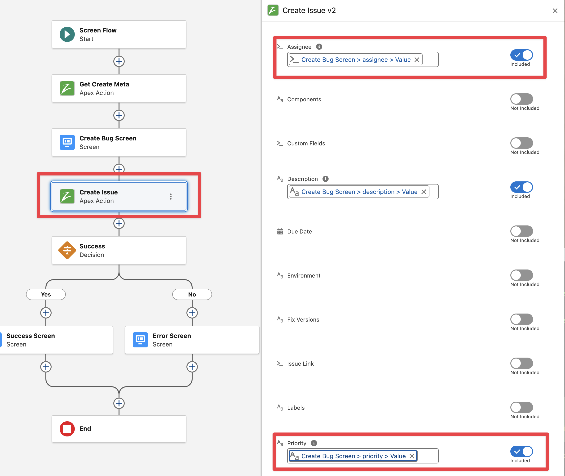 Edit the “Create Issue v2“ action and pass the “Priority” and “Assignee“ fields (from the Screen Component Values)