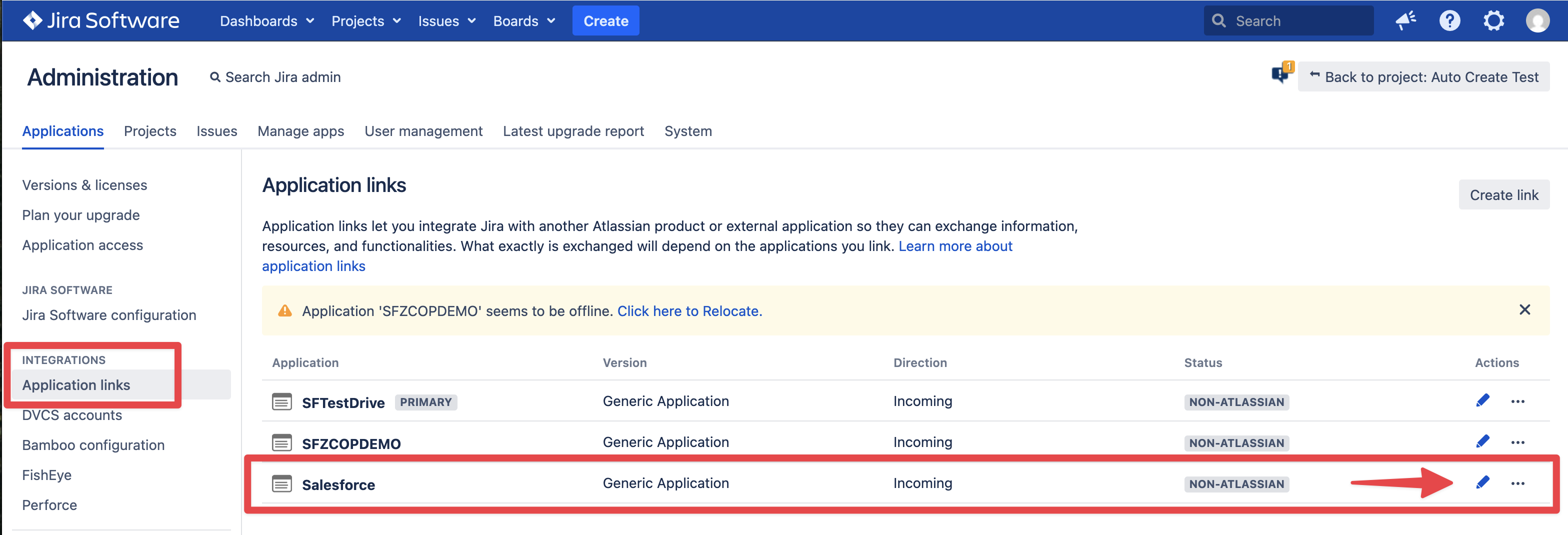 After creating the Auth. Provider copy the Callback URL to the clipboard and go to Jira Administration → Applications → Application Links and edit the external incoming application link created before