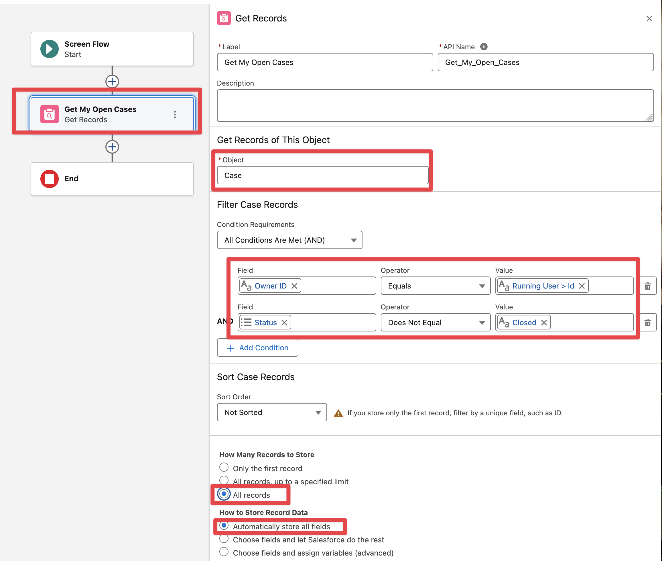 Add a “Get Records“ element to query all the Open Cases whose Owner is the current user
