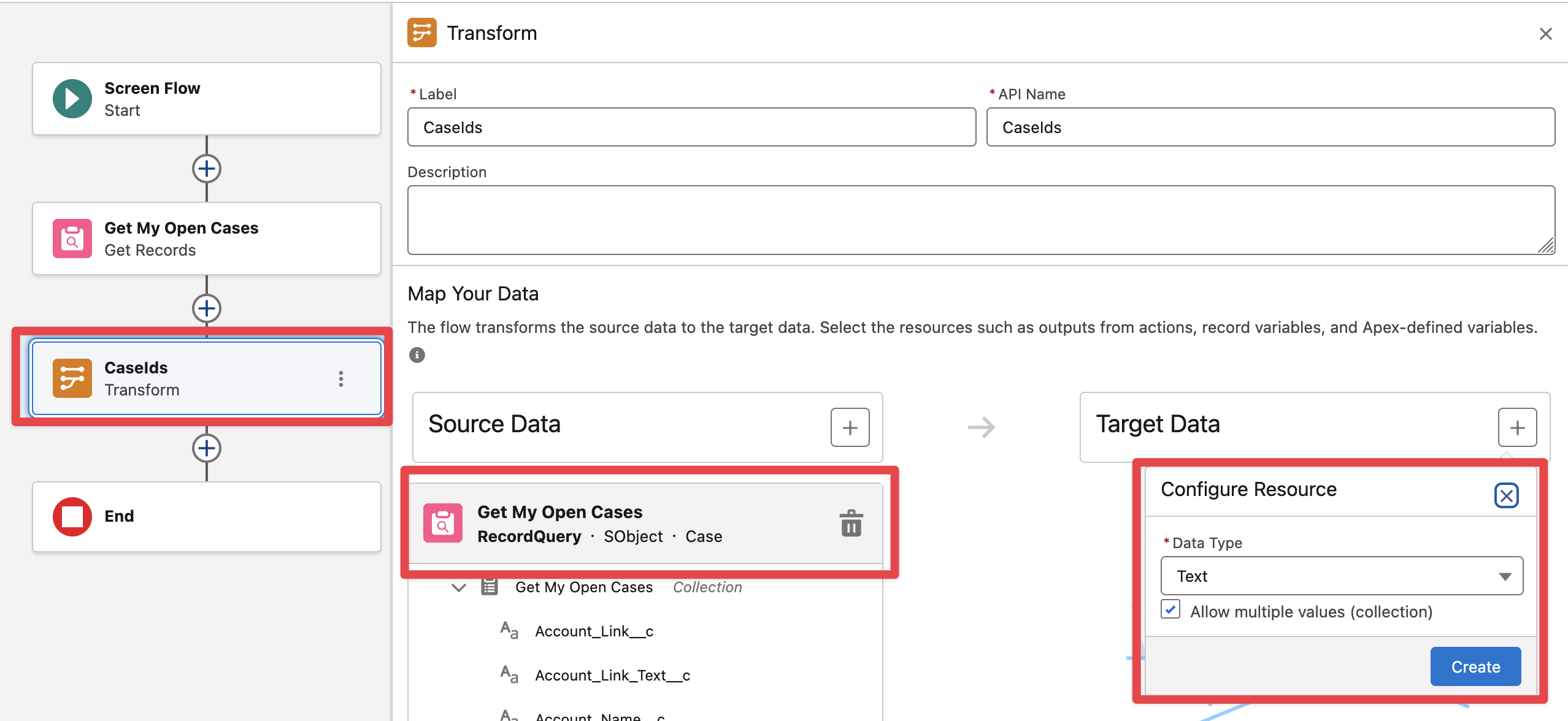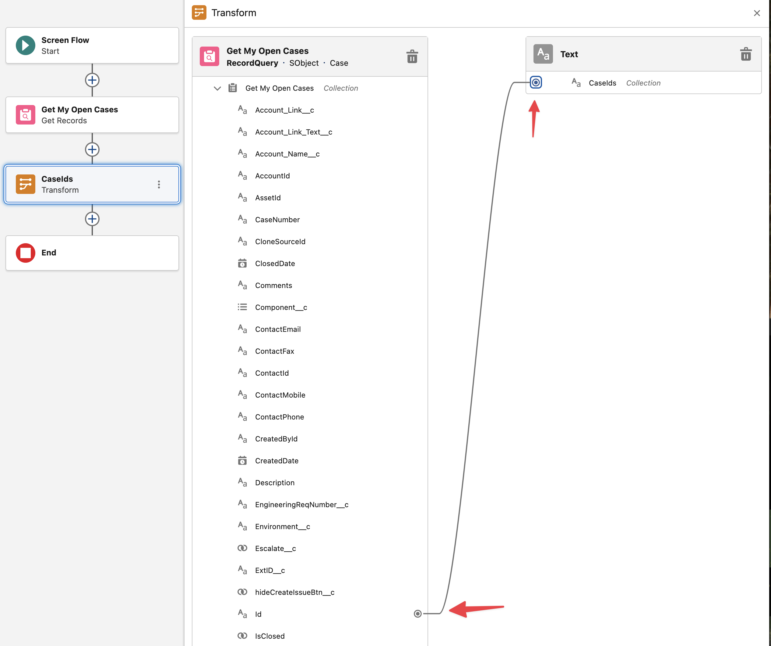 Add a “Transform“ element to collect all the Case Ids from the previous query and set them in a Text Collection
