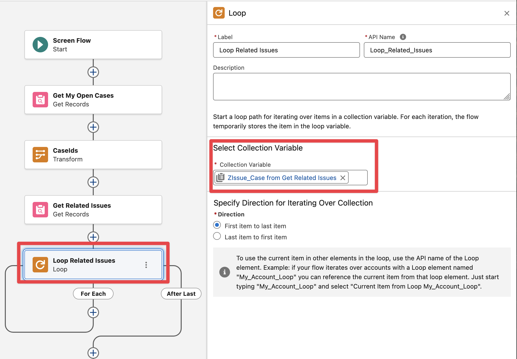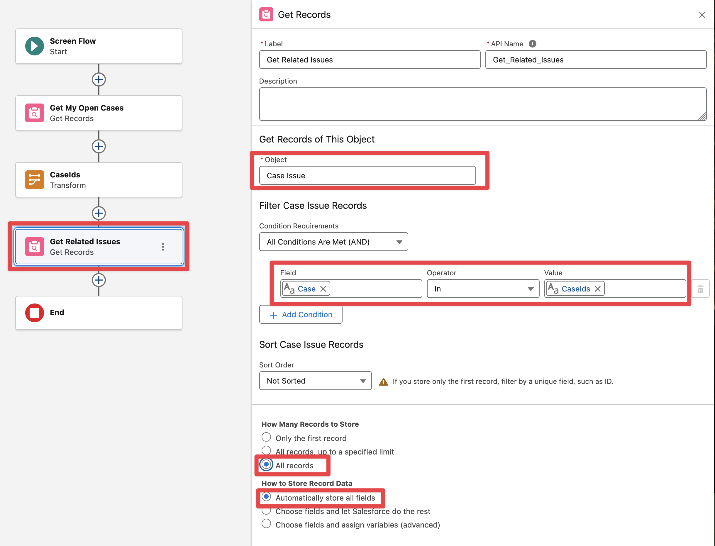 Add another “Get Records“ element to query all the related Issues (Case Issues junction object) for the Open Cases Ids