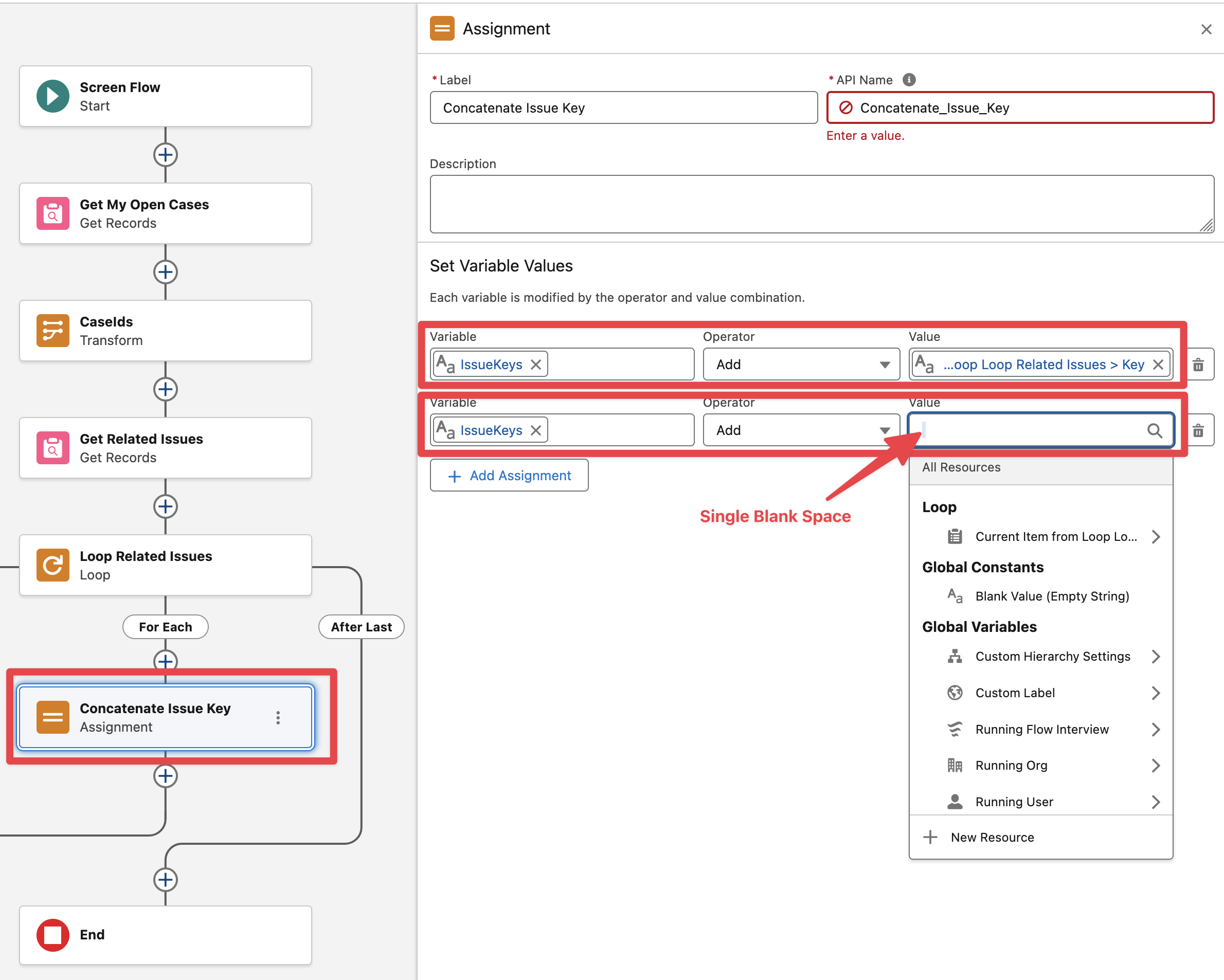 Add an Assignment element in the Loop to append the “Key“ (Issue Key) field from the loop current iteration and also append a Blank space to the Issue Keys text variable