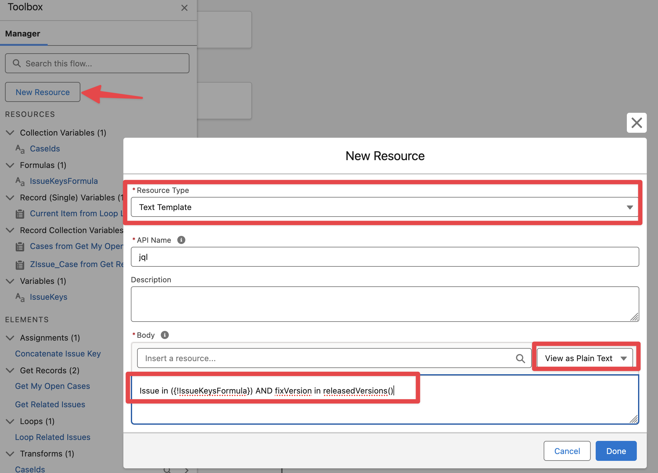 Add a Text Template resource to build the Jira JQL query string. This JQL query filters only the Issues where its fix Version(s) has been released in the Project in Jira for all the Issue Keys we are passing (Issue keys related to ”My” Open Cases)