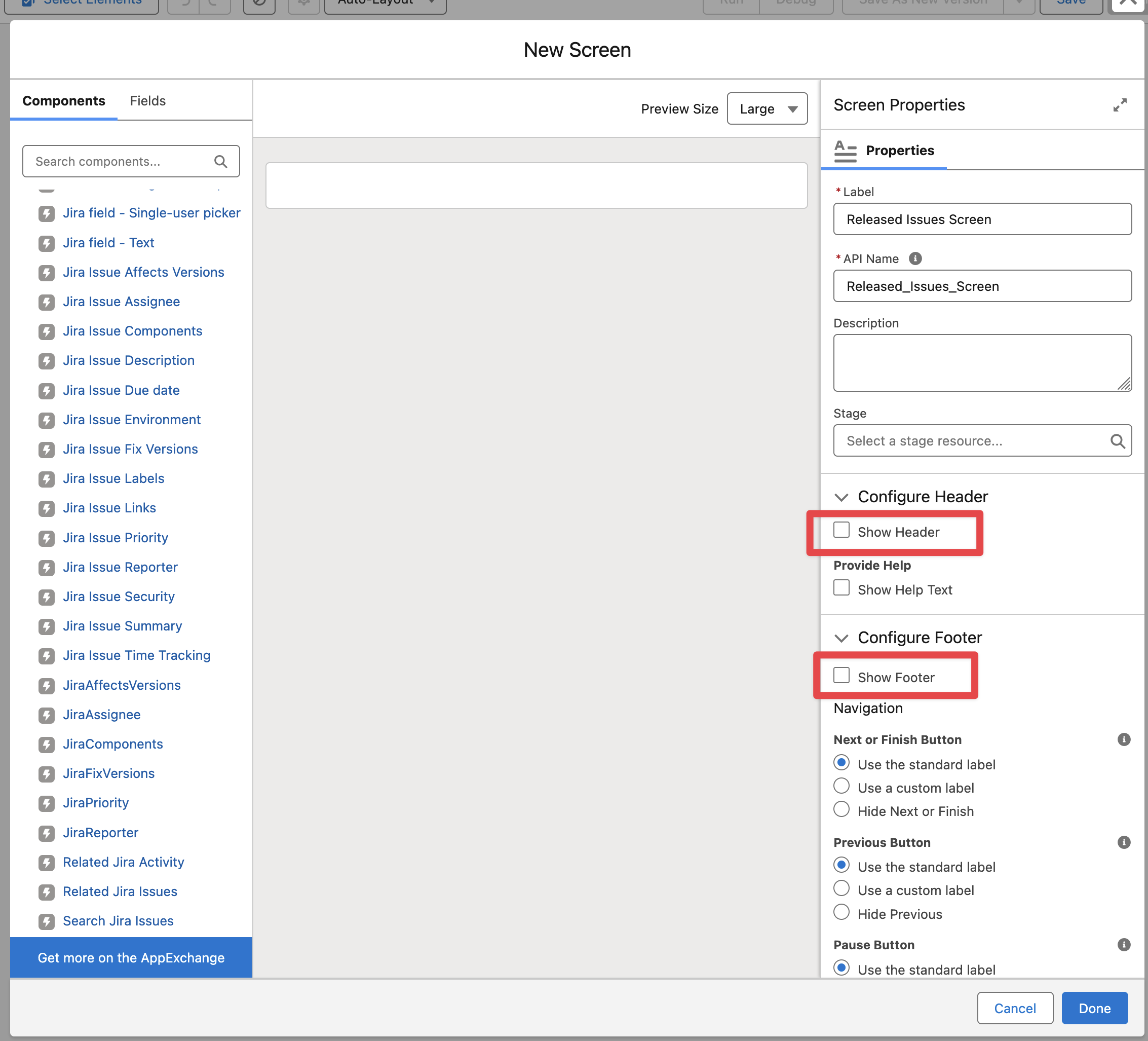 Add a Screen element after the Loop element, hide the header and footer and add the “Search Jira Issues“ component