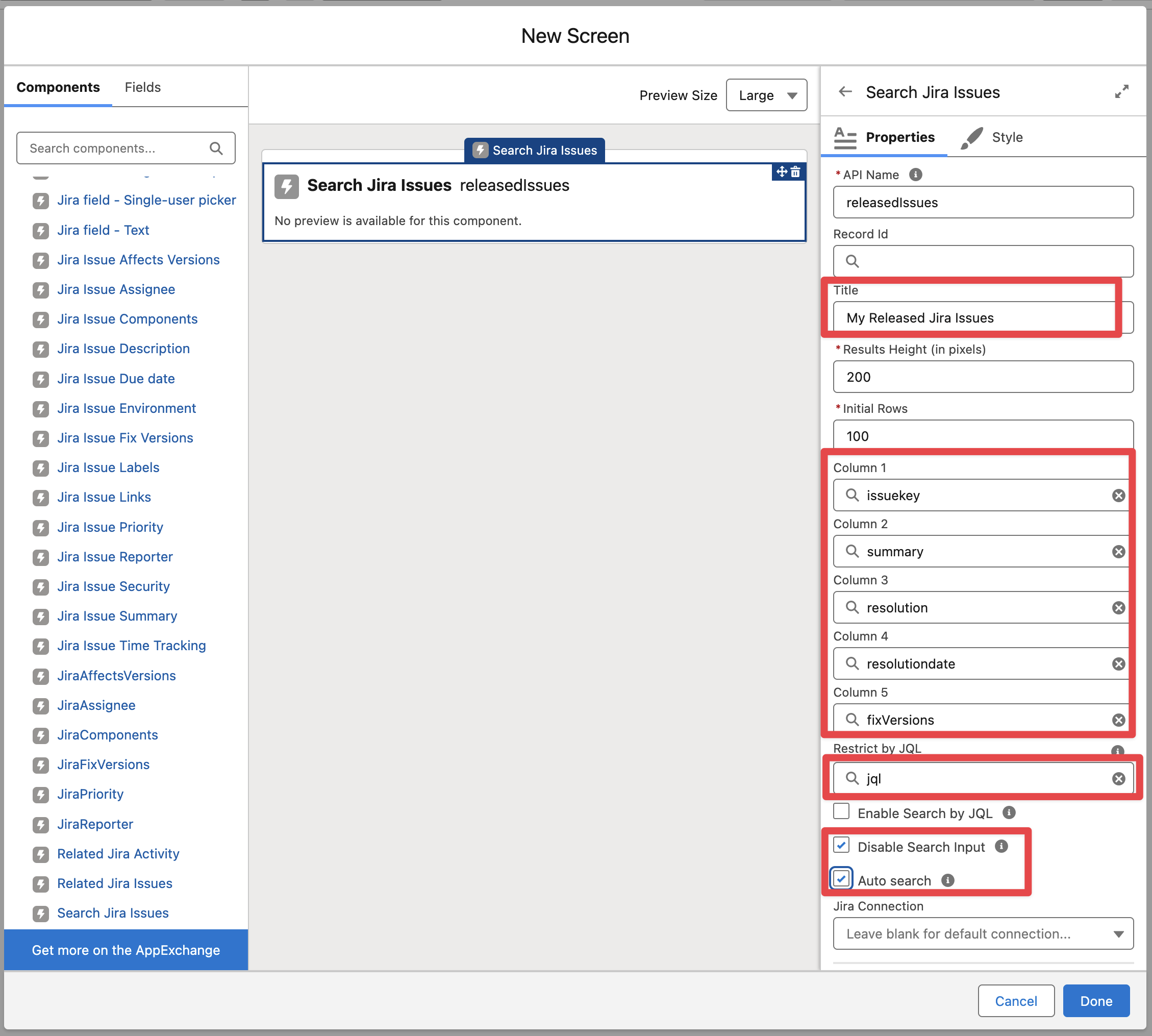 The Search Jira Issues Flow Screen Component, lets user search for Issues in Jira and link them to the specified Salesforce record Id. It can also be used to display a list of Jira Issues from a pre-defined JQL query.