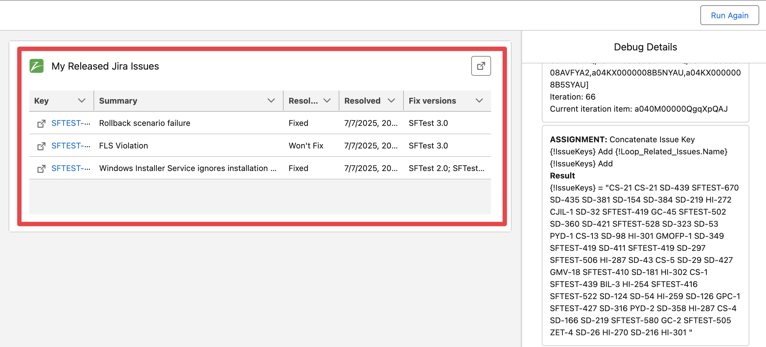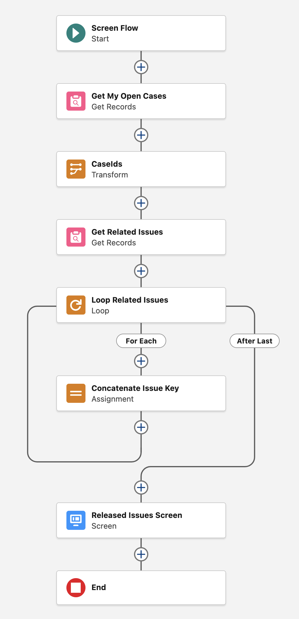 The following example flow uses the “Search Jira Issues“ screen component to show all the Jira Issues that have been released in Jira (meaning its fix Version has been released in the corresponding Jira Project) for all the Open Cases of the current Salesforce User. This is useful for example for Salesforce agents to send notification to customers that a new software version has been released and addresses some Bugs reported by the customer.