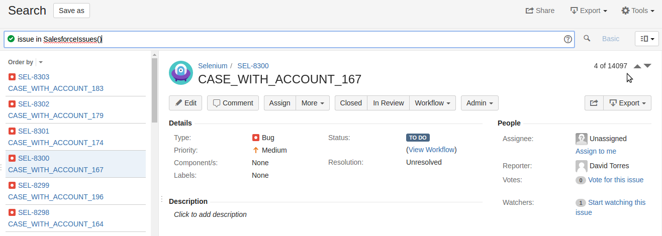This function is used to filter JIRA Issues (with related Cases) based on Case object properties and/or Case-related objects using SOQL (Salesforce Object Query Language) condition expression inside JQL (JIRA Query Language).