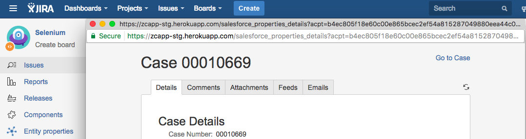 Via configuration options (Case Tab Settings) in the zAgileConnect Add-on administration in JIRA, Case Emails and Case Feeds may optionally be accessible to the user within the context of the related JIRA Issue via Case Detail pop up.  Additional options may also be configured to allow embedded images and attachments in Feeds and Emails to be accessed for downloading either locally or importing directly into the Issue.