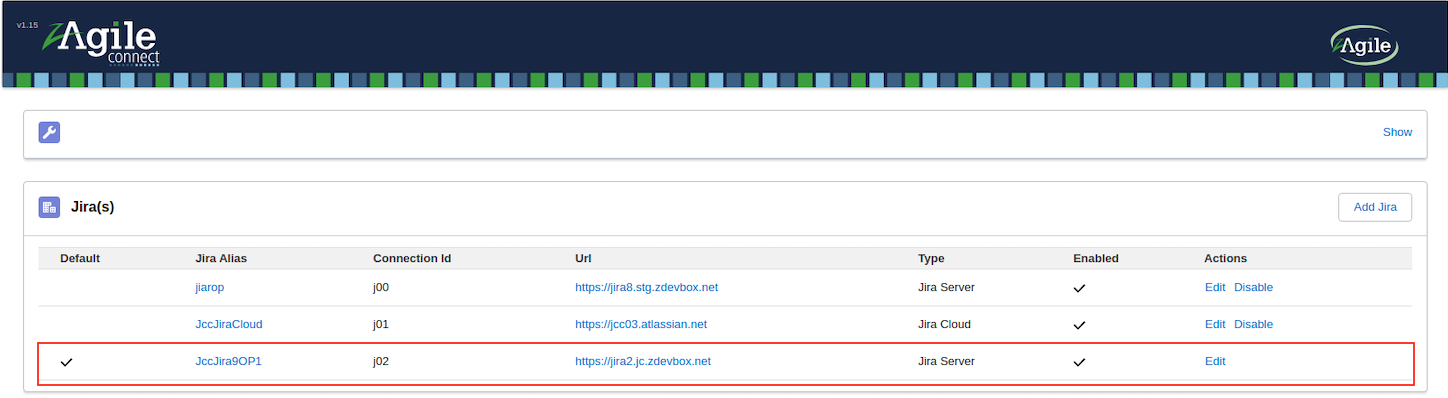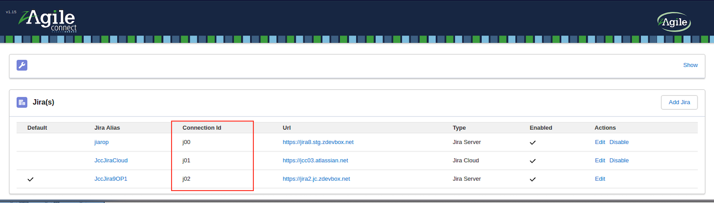 The Jira Connection ID is a unique identifier for specifying a Jira when calling the zAgileConnect API. For example, to send an attachment to the Jira JccJiraCloud, specify its Jira Connection ID j01 when calling the method: