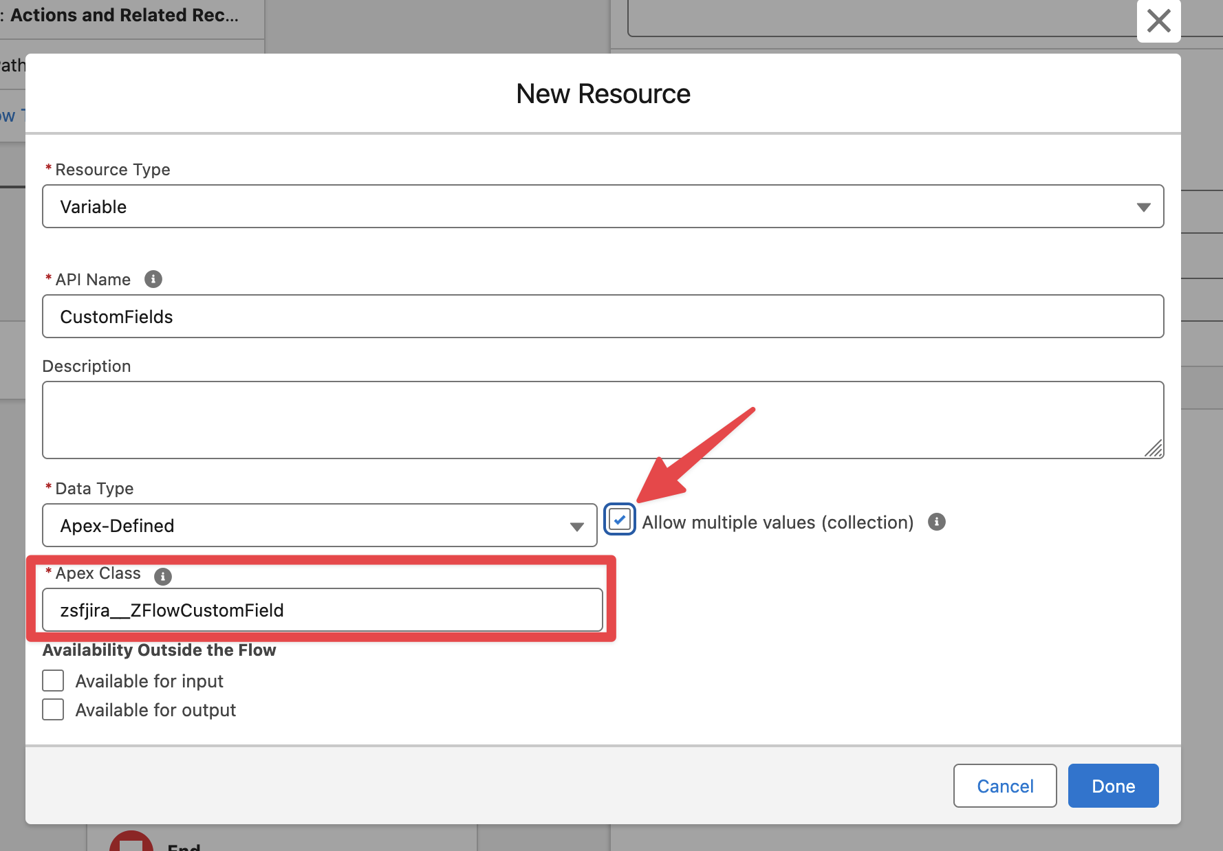 Custom Fields | The list of custom fields, it accepts a list of ZFlowCustomField apex objects. | ||