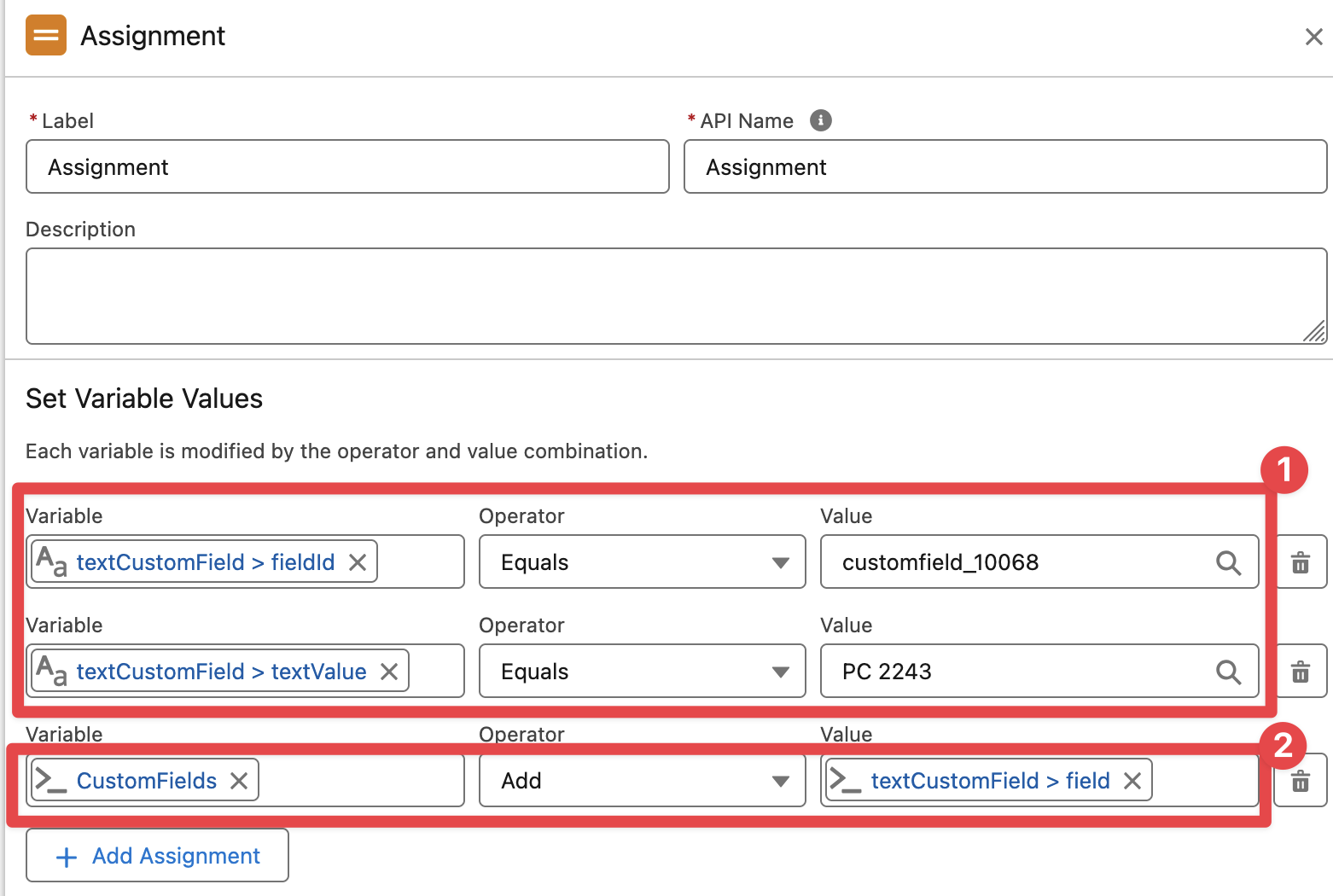 Then create a variable for each custom field (an Apex-Defined variable resource of the desired type), for example for a text custom field: