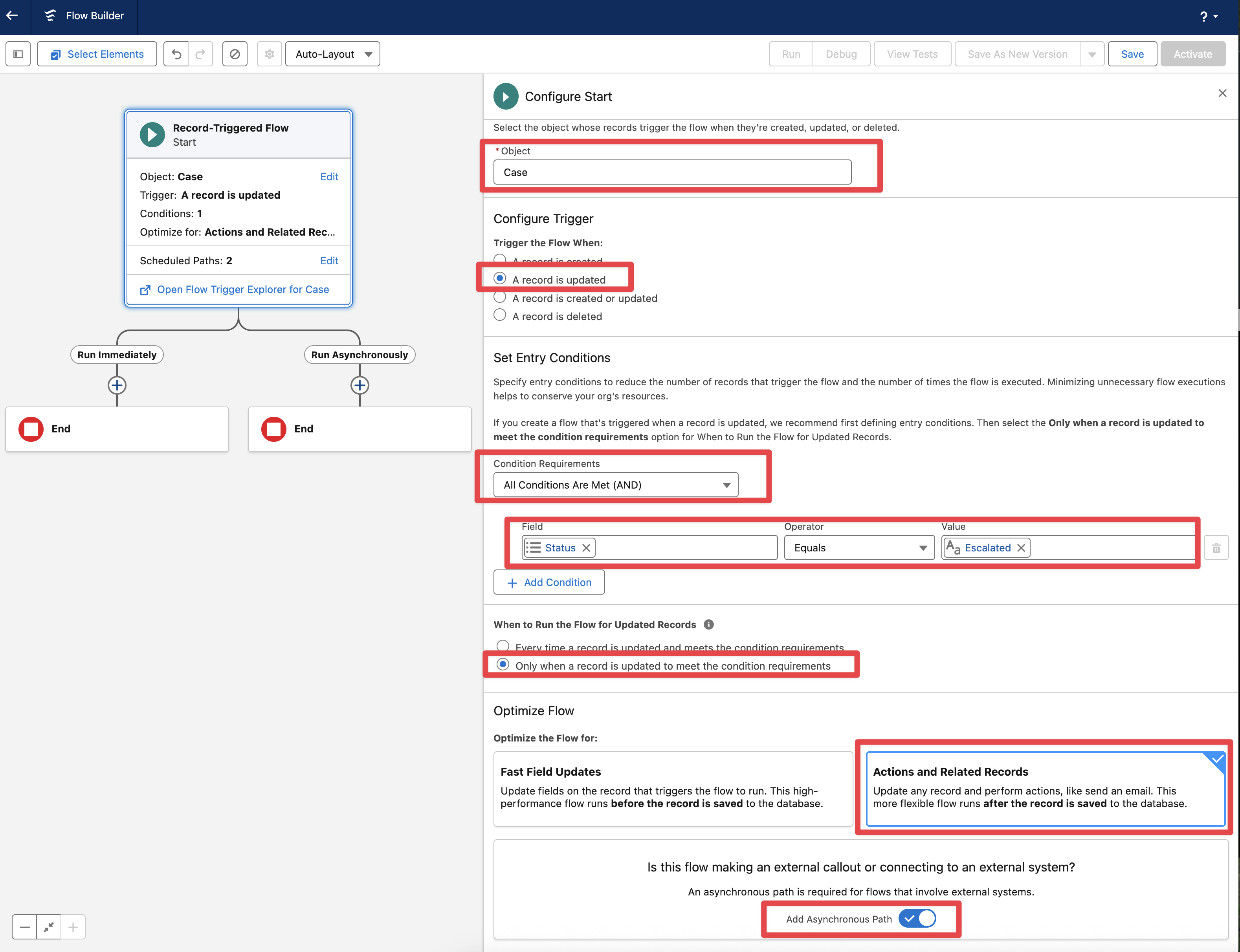 Finally Save and Activate the flow. Then go to a Case and update the Case Status to “Escalated“, a new Jira Issue must be automatically created, refresh the page to view the Issue in the Related Jira Issues Section.